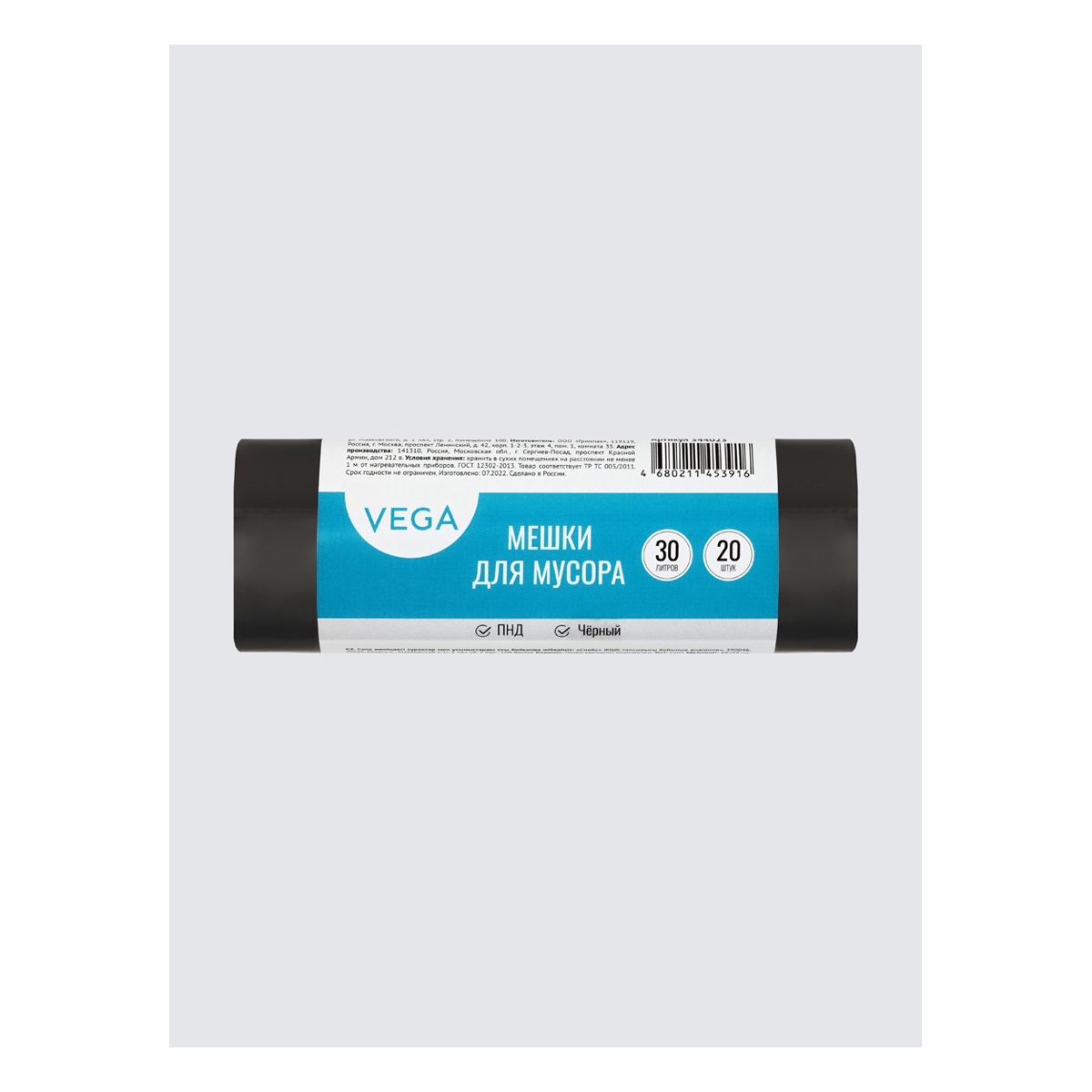 Мешки для мусора VEGA производятся из полиэтилена низкого давления (ПНД). Мешки объемом 30 литров размера 48*55 см плотностью 5 мкм используются для хозяйственных, промышленных нужд. В рулоне 20 штук. <br/>ПНД – тонкий, шуршащий материал химически нейтральный, не вступает в реакцию с жирами и кислотами и не подвержен гниению. <br/>• Объем мешков: 30 л.;<br/>• Плотность: 5 мкм;<br/>• Размер: 48*55 см (+-5%);<br/>• Количество: 20 штук.