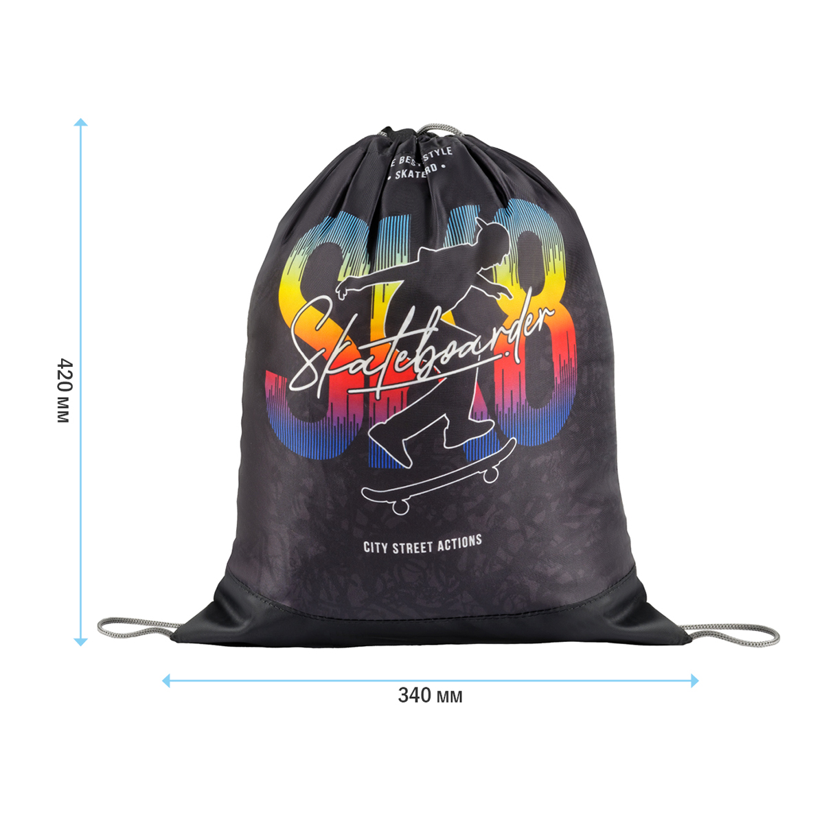 Удобный мешок для обуви ArtSpace Skateboard с одним отделением изготовлено из полиэстера и имеет размер 340*420 мм. Затягивающийся шнурок позволяет нести мешок как в руках, так и за спиной.<br/>• Размер: 340*420 мм;<br/>• Материал: полиэстер;<br/>• Количество отделений: 1;<br/>• Пол: мужской.