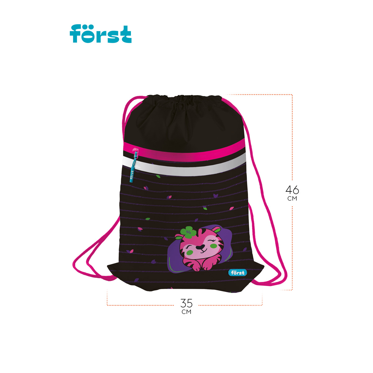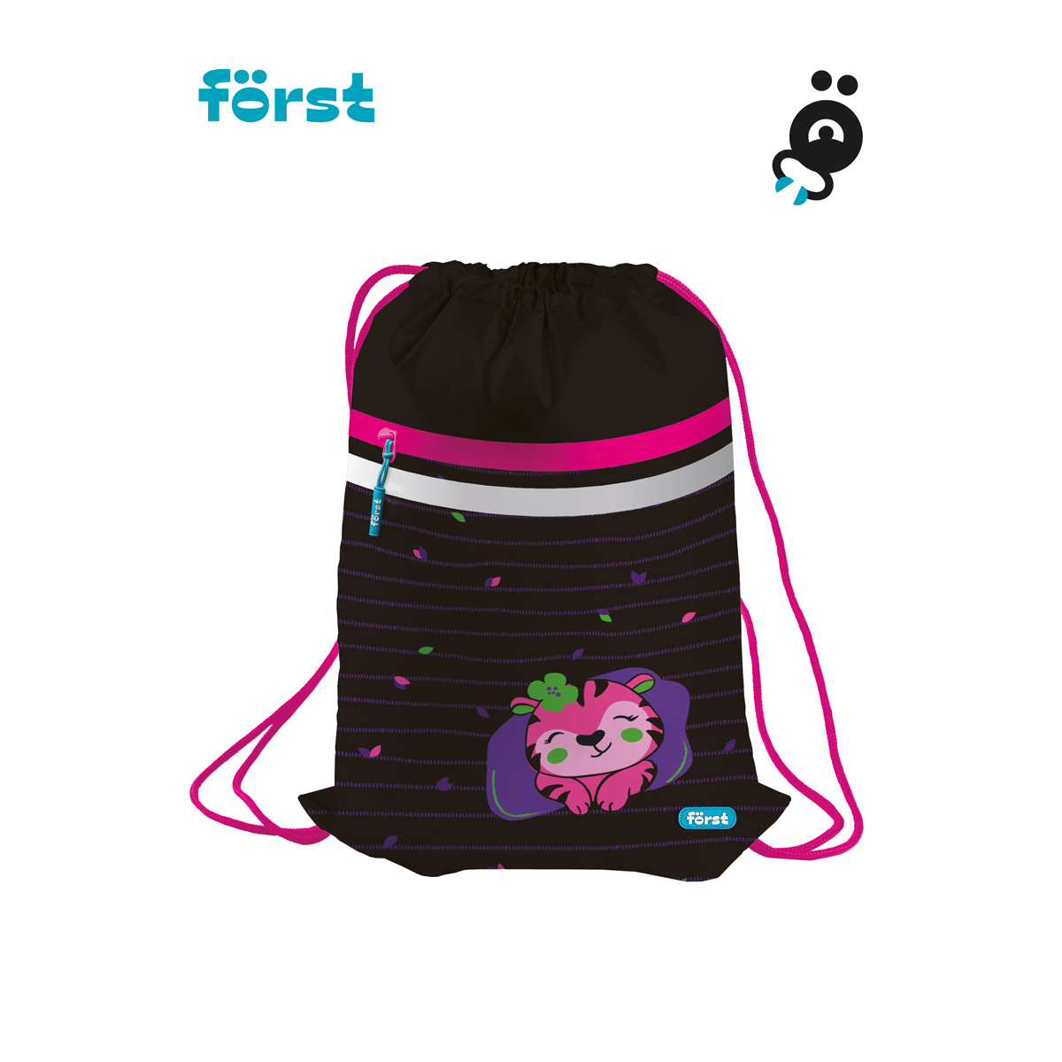Удобный мешок для обуви Först Pink tiger с широкими шнурками, световозвращающей лентой, вентиляционной сеточкой сзади и вместительным передним карманом на молнии. Размер изделия 350*460 мм. Изготовлен из плотного высококачественного полиэстера, идеален как для зимней обуви, так и для спортивной экипировки. Индивидуальная упаковка.<br/>• Размер: 350*460 мм;<br/>• Материал: полиэстер;<br/>• Количество отделений: 1;<br/>• Карман на молнии: да;<br/>• Световозвращающие элементы: да;<br/>• Пол: женский.