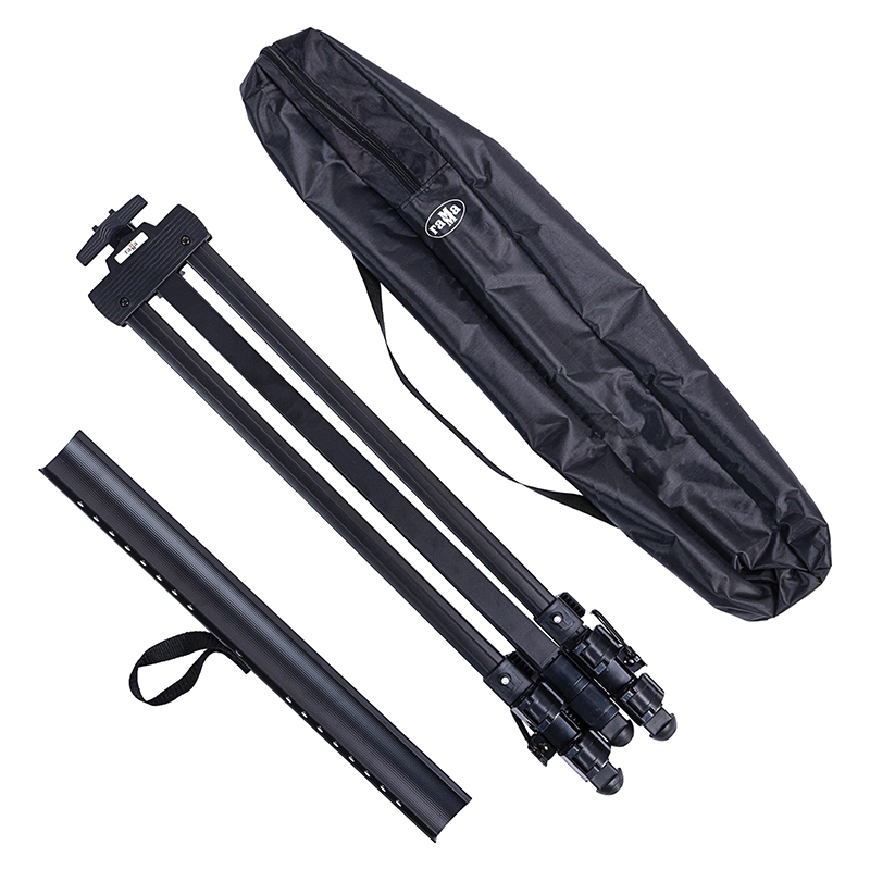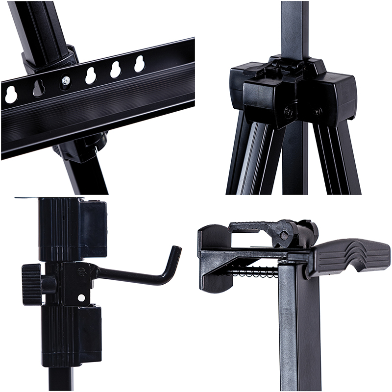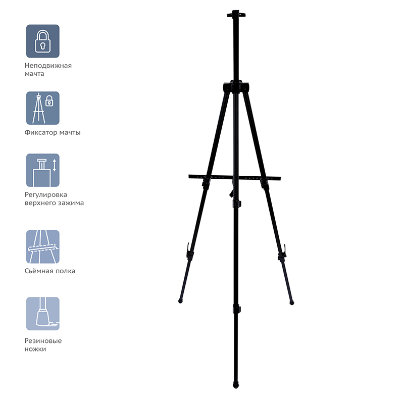 Лёгкий и прочный мольберт оснащён телескопическими ножки, которые легко раскладываются, а пластиковые опоры обеспечивают устойчивость даже на неровной поверхности. Оснащён съёмной полкой-упором для холста. Мольберт подходит для работы с большими форматами. Изготовлен из алюминия. Чехол для бережного хранения и удобной транспортировки — в комплекте.