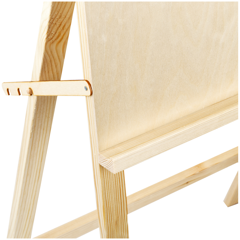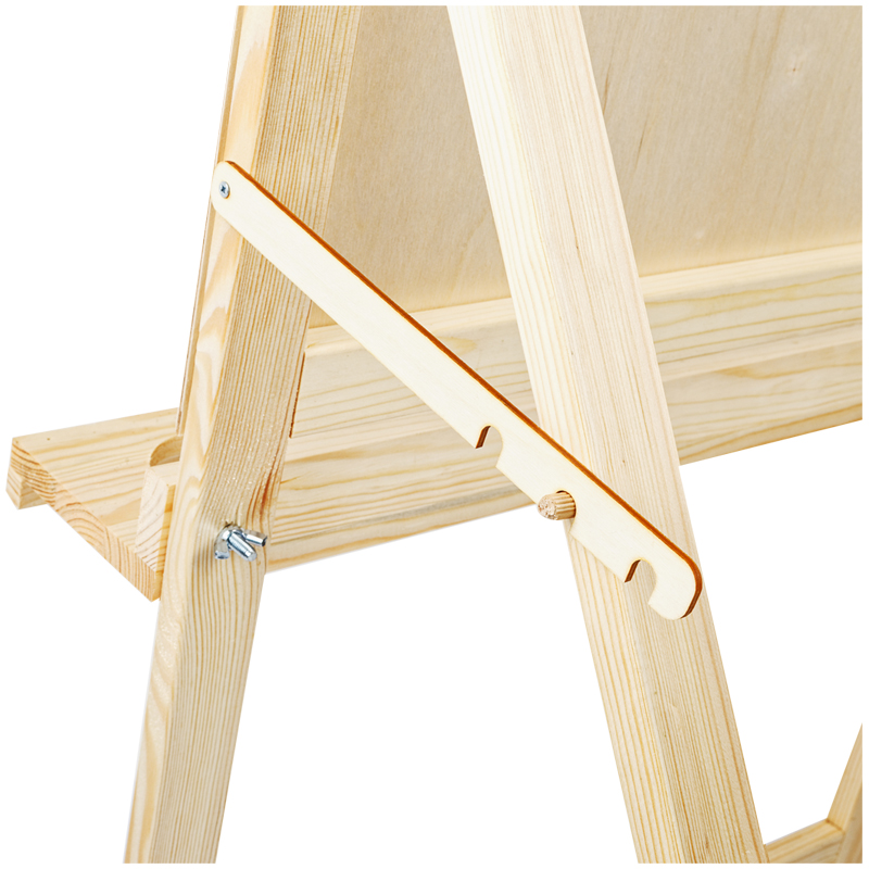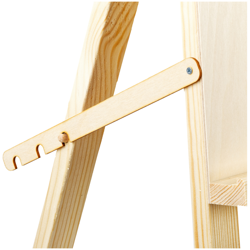 Мольберт имеет простую конструкцию: три положения угла наклона рабочей поверхности, полка с бортиком для художественных материалов. Бумагу на планшете можно закрепить кнопками или малярным скотчем. Мольберт производится в России из сосны и фанеры первого сорта. Все поверхности зашлифованы для безопасности и комфорта работы художника. Мольберт подходит для занятий в студии и дома, он складывается и не занимает много места при хранении.