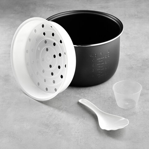В комплекте ложка для перемешивания, мерный стакан, емкость для приготовления на пару.