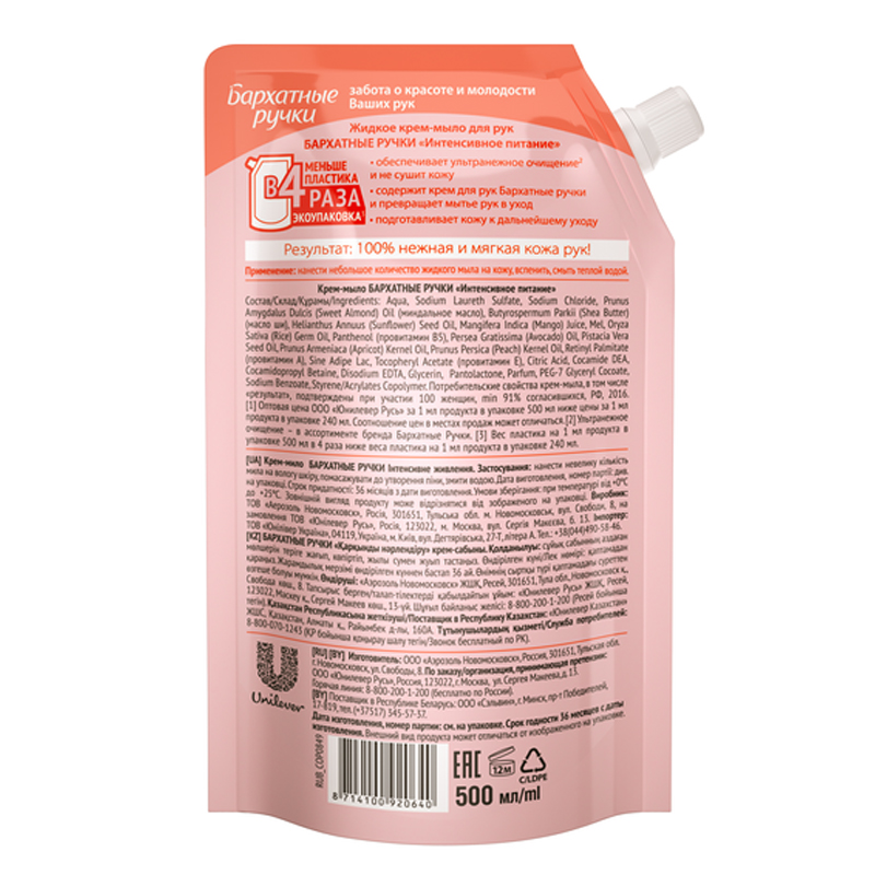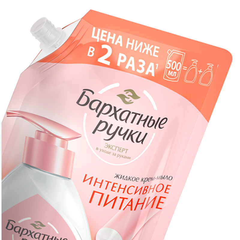 Жидкое крем-мыло "Интенсивное питание" в мягкой эко-упаковке используется в 4 раза меньше пластика, а цена мыла в 2 раза выгоднее по сравнению с обычной упаковкой мыла с дозатором. Крем-мыло содержит крем "Бархатные Ручки", за счет чего обеспечивает нежное очищение и питание кожи во время мытья рук. Не содержит красителей. Соответствует естественному уровню pH кожи. Масло ШИ питает и восстанавливает клетки кожи,оказывает смягчающее, увлажняющее и защитное действие. Подходит для ухода за кожей любого типа, особенно за сухой, раздраженной, поврежденной.<br/>Пантенол способствует восстановлению клеток, обладает увлажняющим и разглаживающим кожу действием. РЕЗУЛЬТАТ: 100% нежная и мягкая кожа рук!