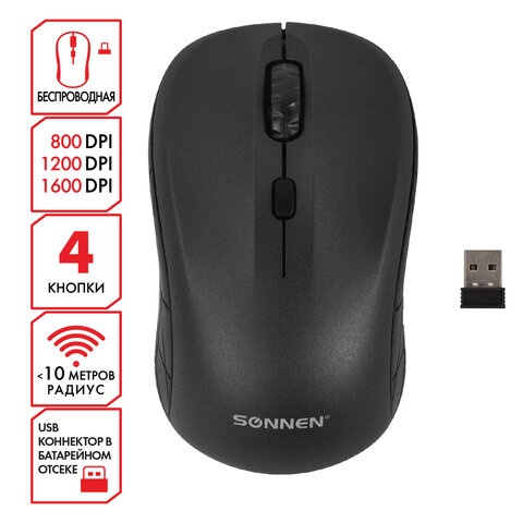 Мышь беспроводная USB, 800/1200/1600 dpi, 5 кнопок + колесо-кнопка, оптическая, SONNEN Q80, черная, 513945