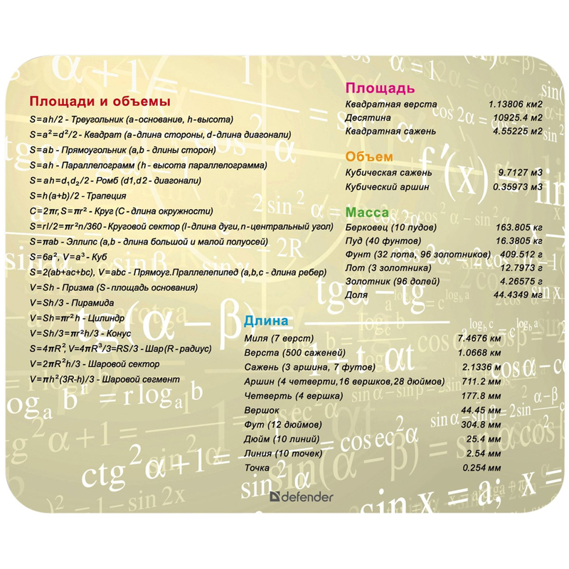 Математические формулы, неправильные глаголы, меры объема и веса и множество других "шпаргалок" по разным предметам всегда будут под рукой. Позволяют коврикам долго сохранять свой внешний вид. Позволяет многократно фиксировать коврик в любом удобном месте рабочей поверхности.