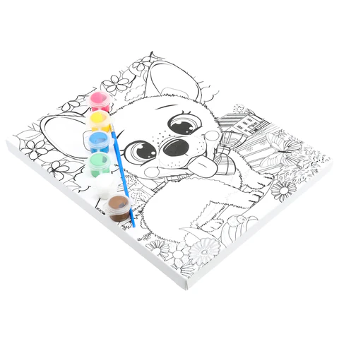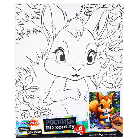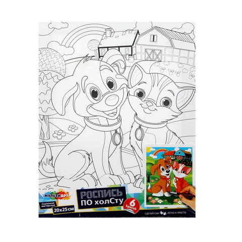 В набор входит: 1 хлопковый холст с контуром, 6 акриловых красок, 1 синтетическая кисть.
