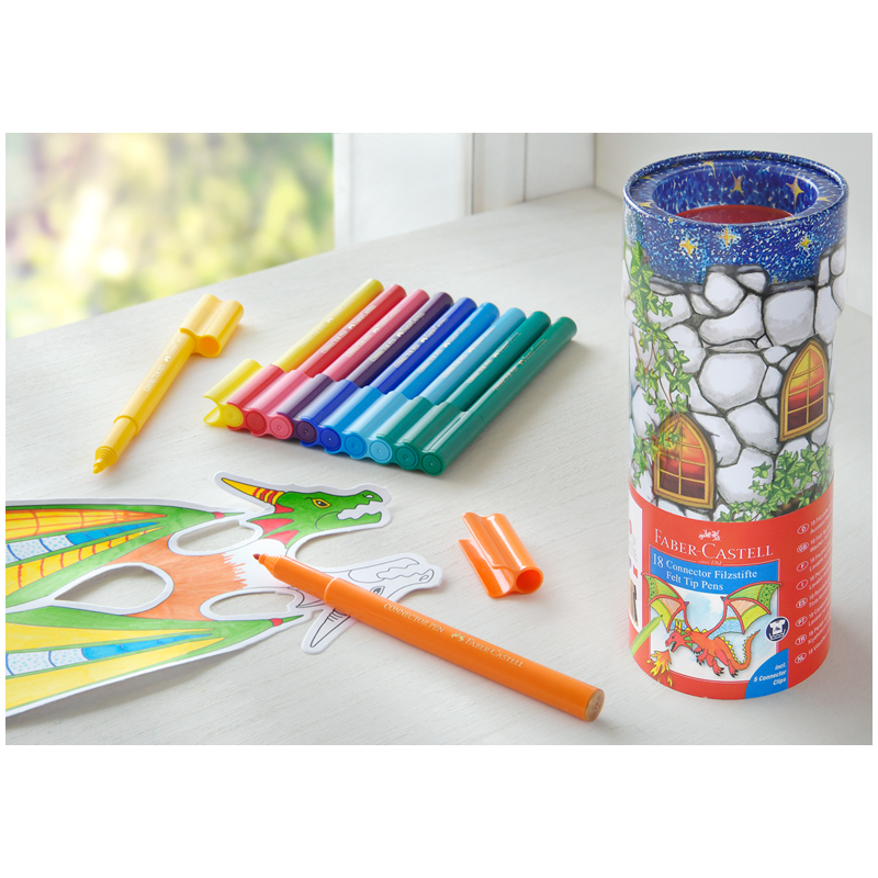 Набор принадлежностей для рисования и творчества Faber-Castel «Connector» позволяет развивать художественные способности ребенка, предоставляя ему неограниченные возможности для творчества. В набор входят: 18 фломастеров, 5 клипс для соединения фломастеров и 2 картинки для раскрашивания. Чернила фломастеров изготовлены на водной основе с использованием натуральных красителей и поражают яркими и насыщенными цветами. Прочный волокнистый пишущий узел выдерживает давление до 3 кг. Вентилируемый колпачок надежно защищает фломастер от высыхания. Подходят для рисования левой и правой рукой. Дополнительное игровое преимущество - фломастеры можно соединять между собой с помощью пластмассовых клипс и создавать не сложные конструкции. Стильный металлический тубус-пенал идеален для хранения и перевозки.Фломастеры хорошо смываются с рук, гладких поверхностей и большинства тканей. Подходят для рисования левой и правой рукой.