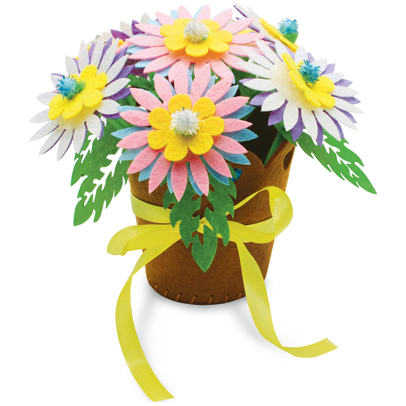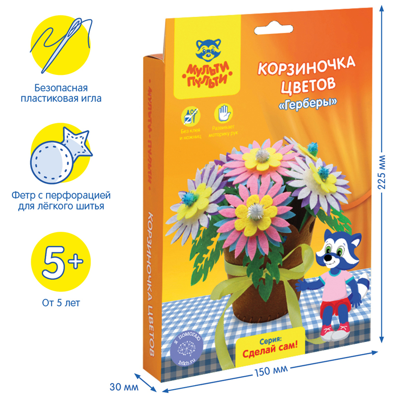 В наборе: элементы из фетра, помопны, синельная проволока, стикеры, пластиковая игла, бумажная стружка, нитка, атласная лента, инструкция.