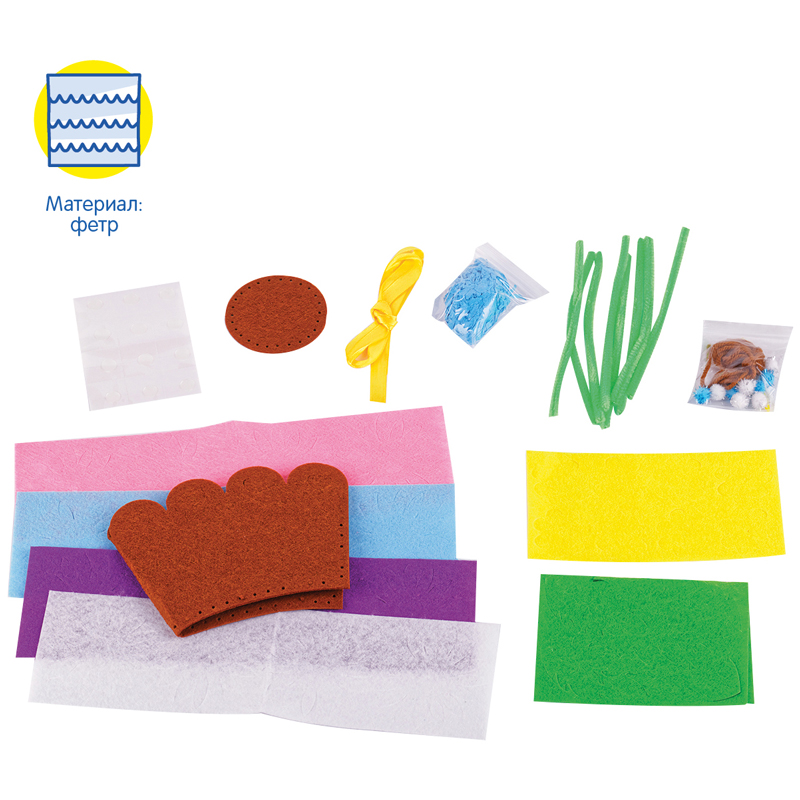 Работа над поделками из фетра - очень увлекательное занятие. Без клея и ножниц Ваш ребенок сможет сделать настоящее произведение искусства. В набор входит все, что необходимо для работы. Работа над данным набором способствует формированию усидчивости и терпению, воображения и внимания, развивает мелкую моторику рук и мышление.<br/>В наборе: элементы из фетра, помопны, синельная проволока, стикеры, пластиковая игла, бумажная стружка, нитка, атласная лента, инструкция.<br/>