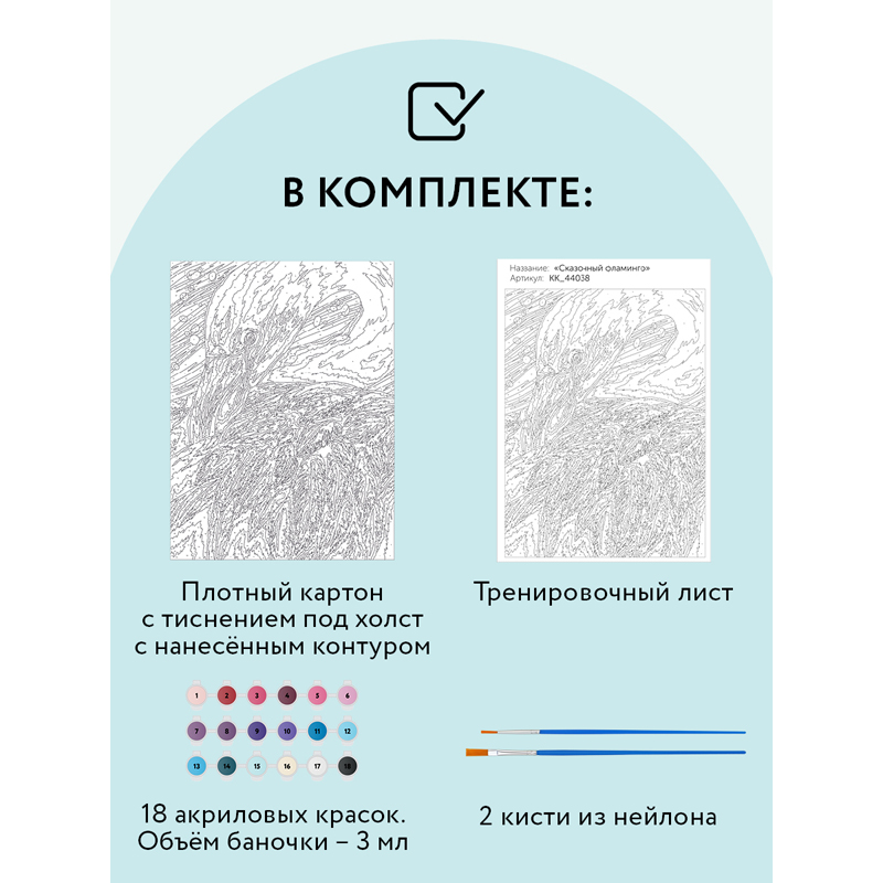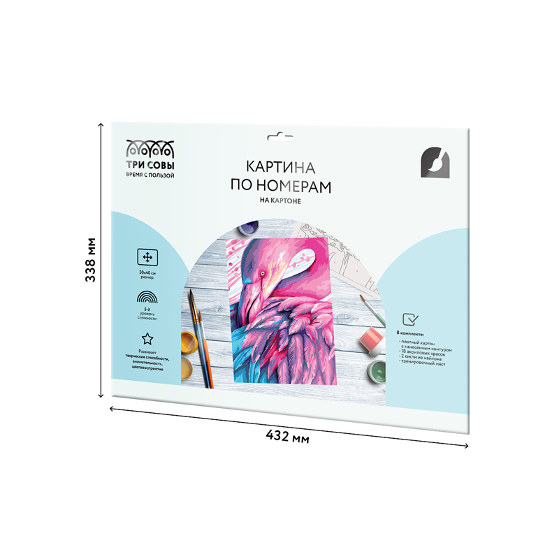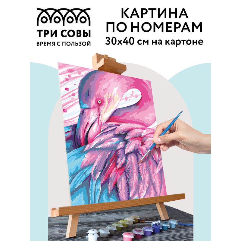 Картина по номерам на картоне бренда «ТРИ СОВЫ» станет увлекательным хобби, которое будет интересно как детям, так и взрослым.<br/>В набор «Сказочный фламинго» входят:<br/>1. плотный картон с тиснением под холст размером 30х40 см с нанесенным контуром, пронумерованный в соответствии с номерами красок;<br/>2. 18 акриловых красок на водной основе в пронумерованных баночках;<br/>3. Кисти из эластичного нейлонового волокна 2 штуки: малая и средняя;<br/>4. лист для тренировки – 1 штука.<br/>Краски обладают высокой плотностью, что позволяет перекрыть нанесенный контур в 1 слой. Технология точной разбивки сюжета картины на разные цветовые оттенки гарантируют правильность выполнения рисунка. Законченная работа с изображением розового фламинго займет почетное место в интерьере или станет отличным подарком.<br/>Рисование по номерам способствует развитию внимания, учит концентрации и аккуратности, помогает понять, как построить фигуру через цветовые оттенки, развивает чувство вкуса. Художником может быть каждый!<br/>«ТРИ СОВЫ» – время с пользой!<br/>• Основа: картон;<br/>• Формат: А3;<br/>• Размер: 30*40 см;<br/>• Уровень сложности: 5;<br/>• Количество баночек с красками: 18.