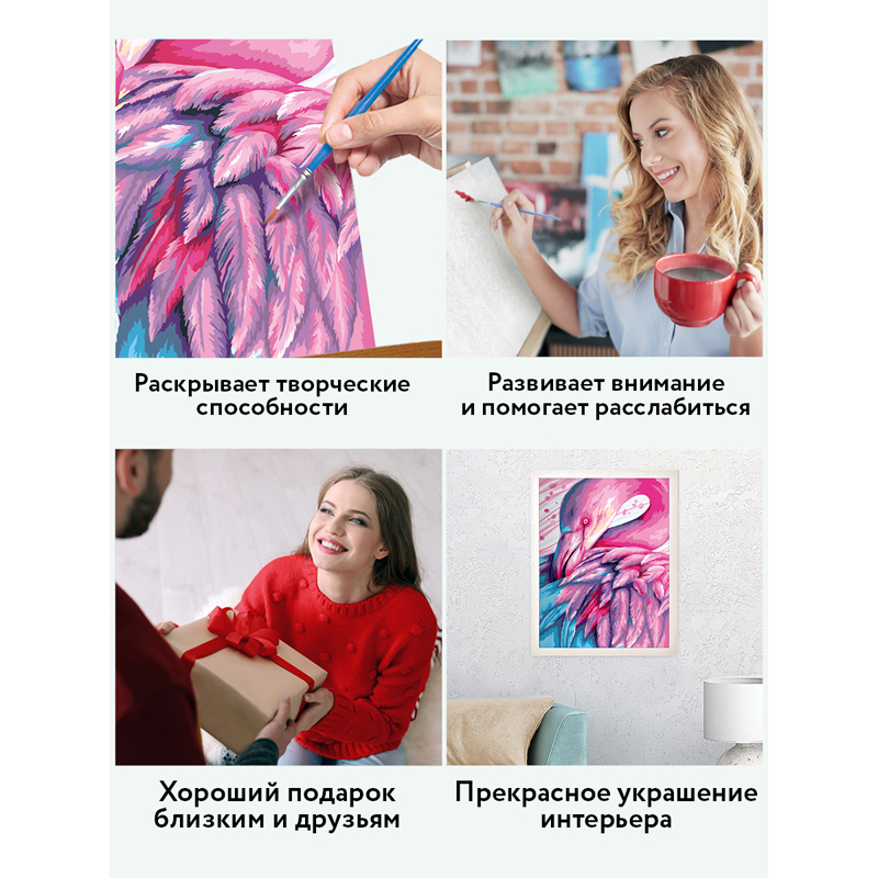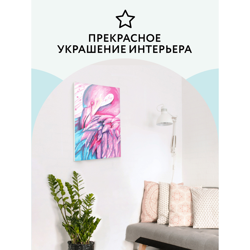 Краски обладают высокой плотностью, что позволяет перекрыть нанесенный контур в 1 слой. Технология точной разбивки сюжета картины на разные цветовые оттенки гарантируют правильность выполнения рисунка. Законченная работа с изображением розового фламинго займет почетное место в интерьере или станет отличным подарком.