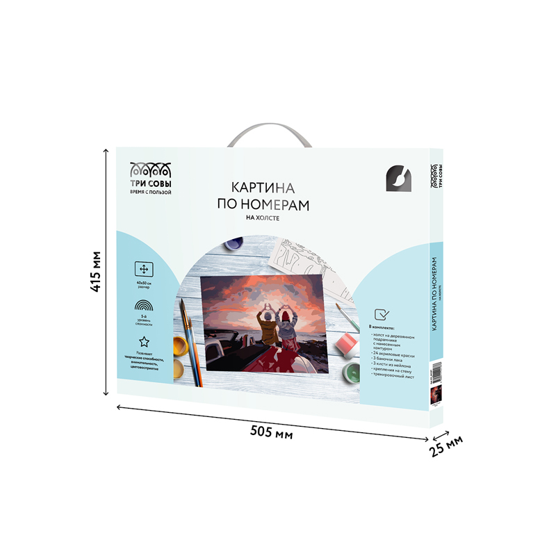 Картина по номерам на холсте ТРИ СОВЫ «Прекрасный вид» раскрывает творческие способности как детей, так и взрослых. Данный метод рисования способствует развитию внимания и концентрации, аккуратности, пониманию концепции построения фигуры через цветовые оттенки, развивает чувство вкуса.<br/>В набор входят:<br/>1) холст на деревянном подрамнике 40*50 с нанесенным контуром, пронумерованный в соответствии с номерами красок. Контур под раскрашивание нанесен в том числе и на торцы подрамника, что позволяет разместить готовую работу на стене, не обрамляя в багет или раму. Технология точной разбивки сюжета картины на разные цветовые оттенки гарантируют правильность исполнения полотна;<br/>2) 24 акриловые краски на водной основе в пронумерованных баночках. Краски с высокой укрывистостью;<br/>3) 3 баночки с глянцевым защитным лаком;<br/>4) 3 кисти из эластичного нейлонового волокна;<br/>5) крепления на стену;<br/>6) тренировочный лист.<br/><br/>«ТРИ СОВЫ» − время с пользой!<br/><br/>• Тематика: люди;<br/>• Уровень сложности: 5.