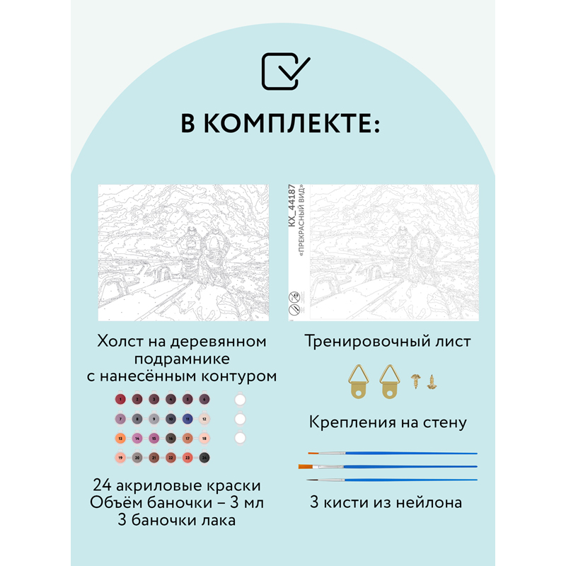 1) холст на деревянном подрамнике 40*50 с нанесенным контуром, пронумерованный в соответствии с номерами красок. Контур под раскрашивание нанесен в том числе и на торцы подрамника, что позволяет разместить готовую работу на стене, не обрамляя в багет или раму. Технология точной разбивки сюжета картины на разные цветовые оттенки гарантируют правильность исполнения полотна;