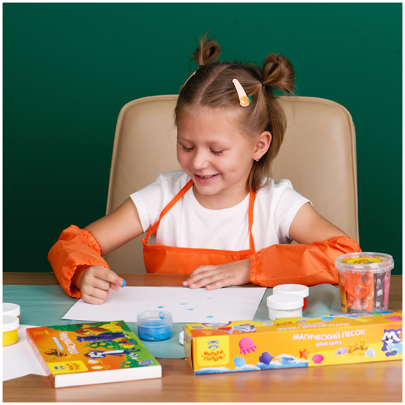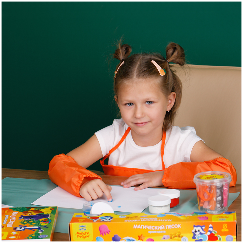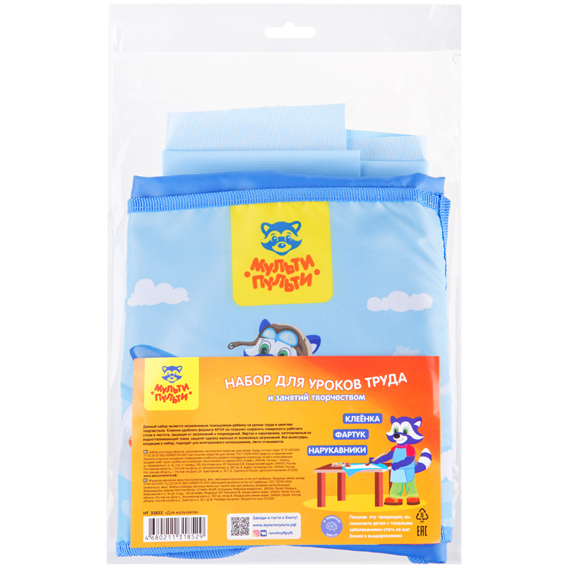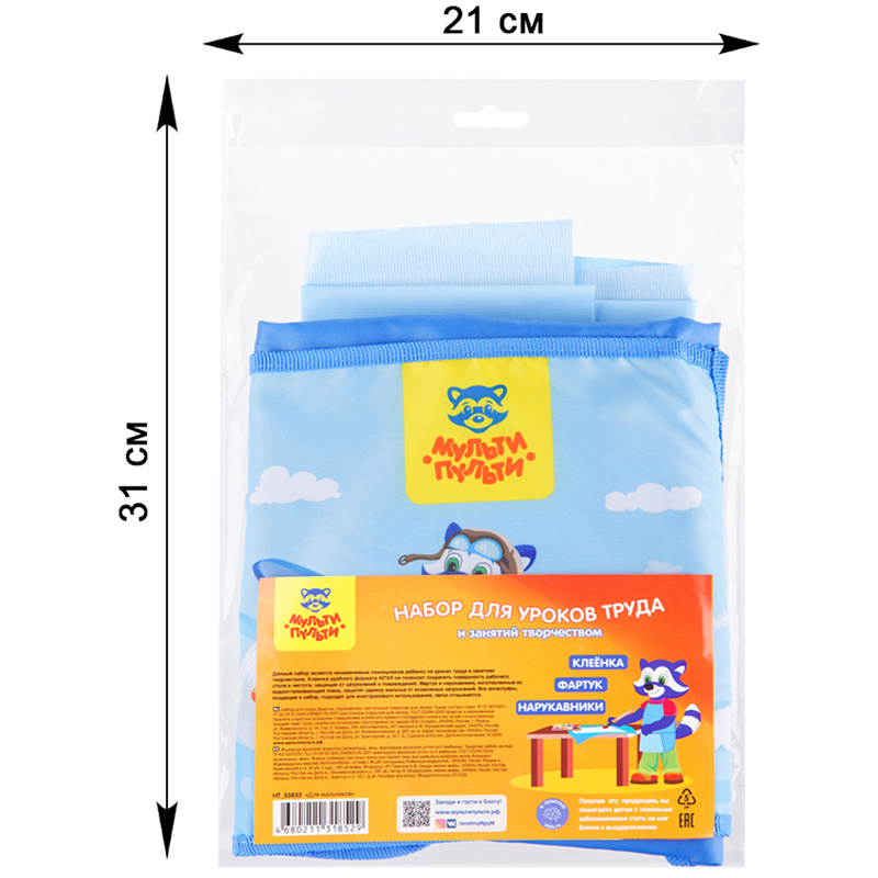 Набор для труда "Мульти-Пульти" является незаменимым помощником на уроках труда и занятиях творчеством. В набор входит: клеенка, фартук и нарукавники. Клеенка удобного формата 40*69 см позволит сохранить поверхность рабочего стола в чистоте, защищая от загрязнений и повреждений. Фартук и нарукавники, изготовленные из специальной водоотталкивающей ткани, защитят одежду малыша от возможных загрязнений. Все аксессуары, входящие в набор, предназначены для многоразового использования и легко отмываются. Упакованы в пластиковый пакет с европодвесом, имеют запоминающийся индивидуальный дизайн и снабжены яркой и информативной этикеткой.