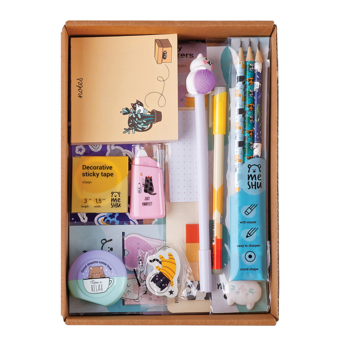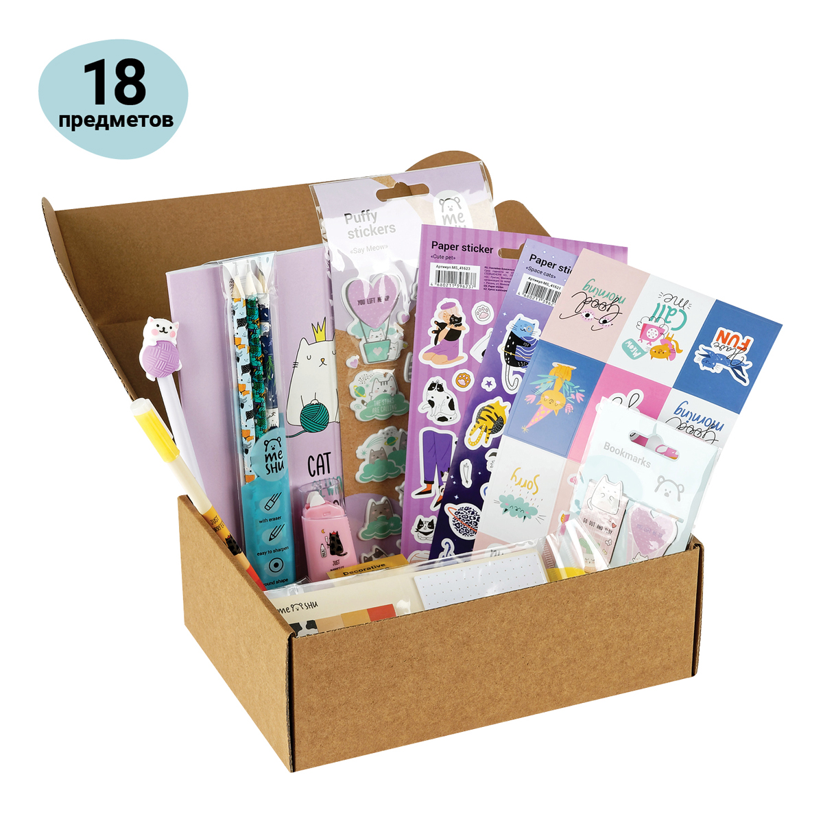 Набор канцелярских принадлежностей MESHU Say meow станет прекрасным подарком к любому празднику. Различные товары для школы и творчества, выполненные в стильных дизайнах MESHU, порадуют ваших близких и будут отличными помощниками в учебе или работе. <br/>Набор содержит 18 предметов:<br/>• бумажная наклейка 3 шт.;<br/>• наклейка ПВХ 1 шт.;<br/>• магнитная закладка 1 шт.;<br/>• линейка 1 шт.;<br/>• карандаш ч/г 3 шт.;<br/>• клейкая лента декоративная 1 шт.;<br/>• тетрадь клетка 1 шт.;<br/>• ручка гелевая стираемая 1 шт.;<br/>• ручка шариковая с топером 1 шт.;<br/>• блок для записей 1 шт.;<br/>• точилка 1 шт.;<br/>• корректирующая лента 1 шт.;<br/>• флажки-закладки 1 шт.;<br/>• ластик 1 шт. <br/>Дизайны предметов в наборе могут варьироваться, но будут соответствовать заявленной теме набора.<br/>• Упаковка: подарочная коробка;<br/>• Количество предметов: 18.