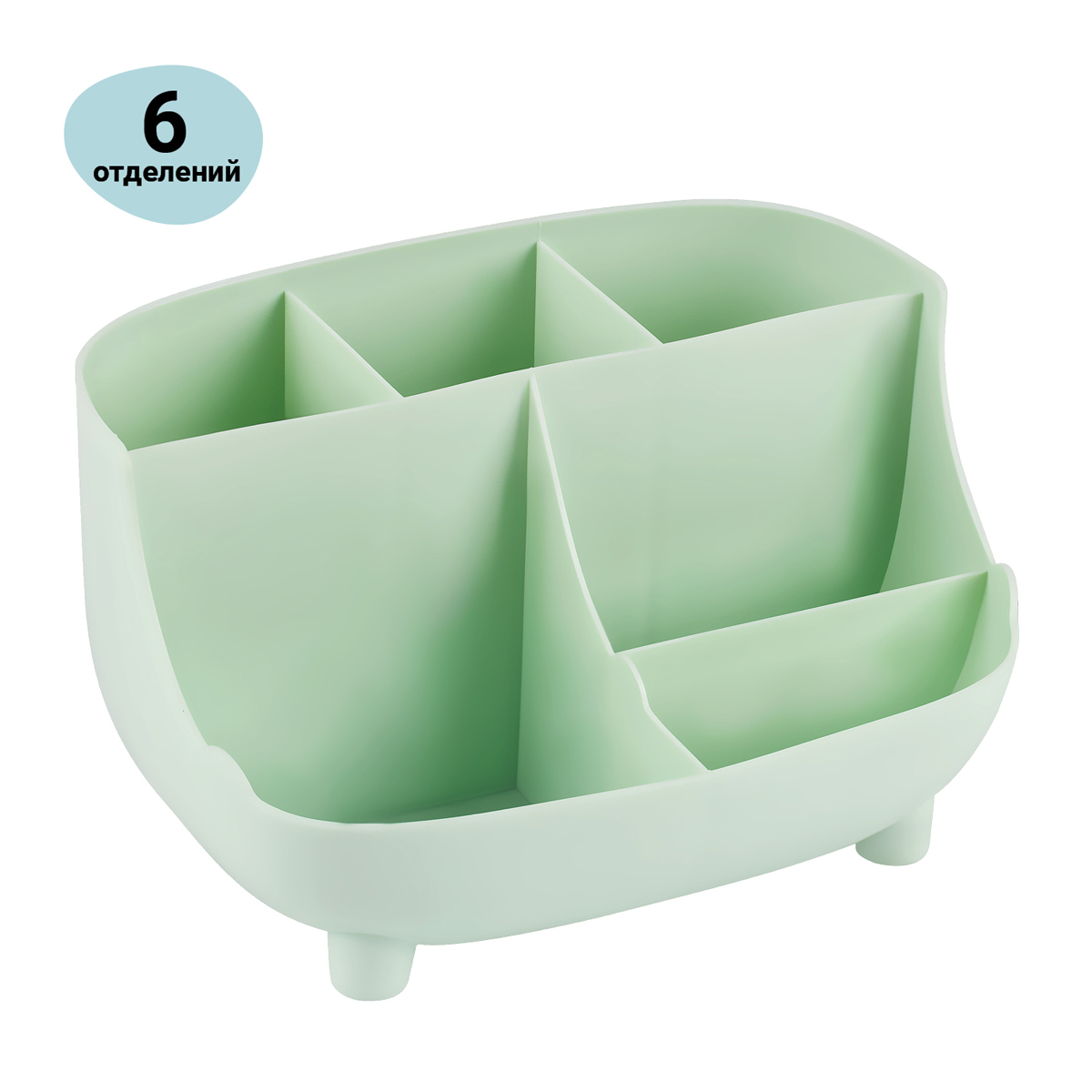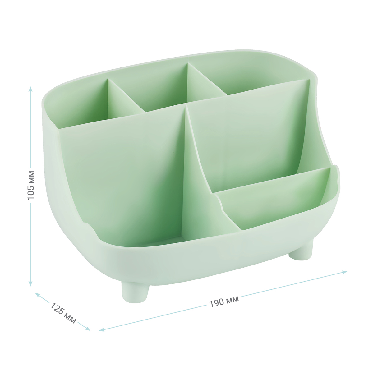 Настольная подставка MESHU в мятном цвете предназначена для хранения пишущих принадлежностей и канцелярских мелочей. Размер – 19*14*11 см. Изделие изготовлено из пластика и имеет 6 отделений. Подставка нежного мятного цвета отлично впишется в любое рабочее пространство и станет милым предметом интерьера. Упакована в ОПП пакет с европодвесом. <br/>• Материал: пластик;<br/>• Цвет: мятный;<br/>• Количество секций: 6;<br/>• Размер: 19*14*11 см.