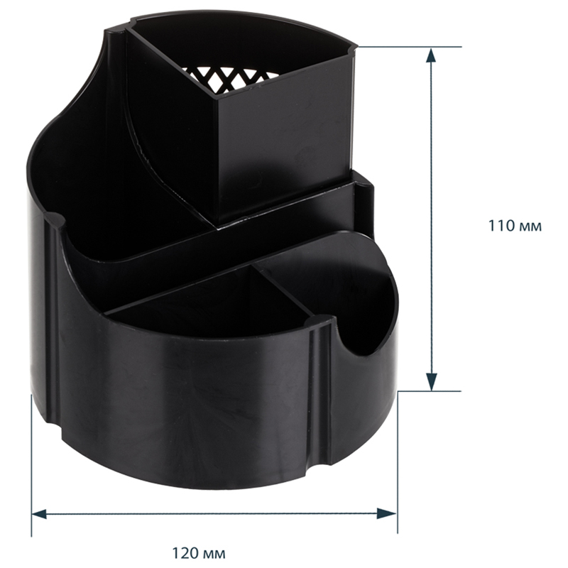 Настольная подставка OfficeSpace Simple с 5 отделениями обладает функциональной и стильной конструкцией, которая подходит для хранения канцелярских мелочей. Прочный чёрный корпус выполнен из высококачественного полистирола. Подставка может вращать органайзер на 360 градусов.<br/>• Материал: полистирол;<br/>• Цвет: чёрный;<br/>• Количество секций: 5;<br/>• Размер: 11*12*12 см.