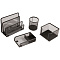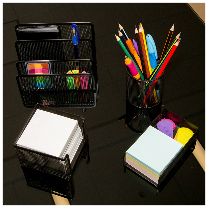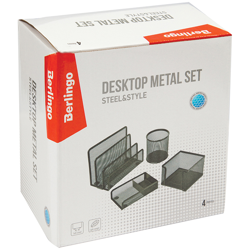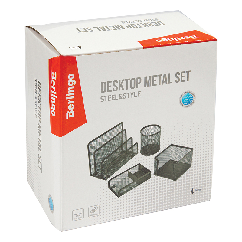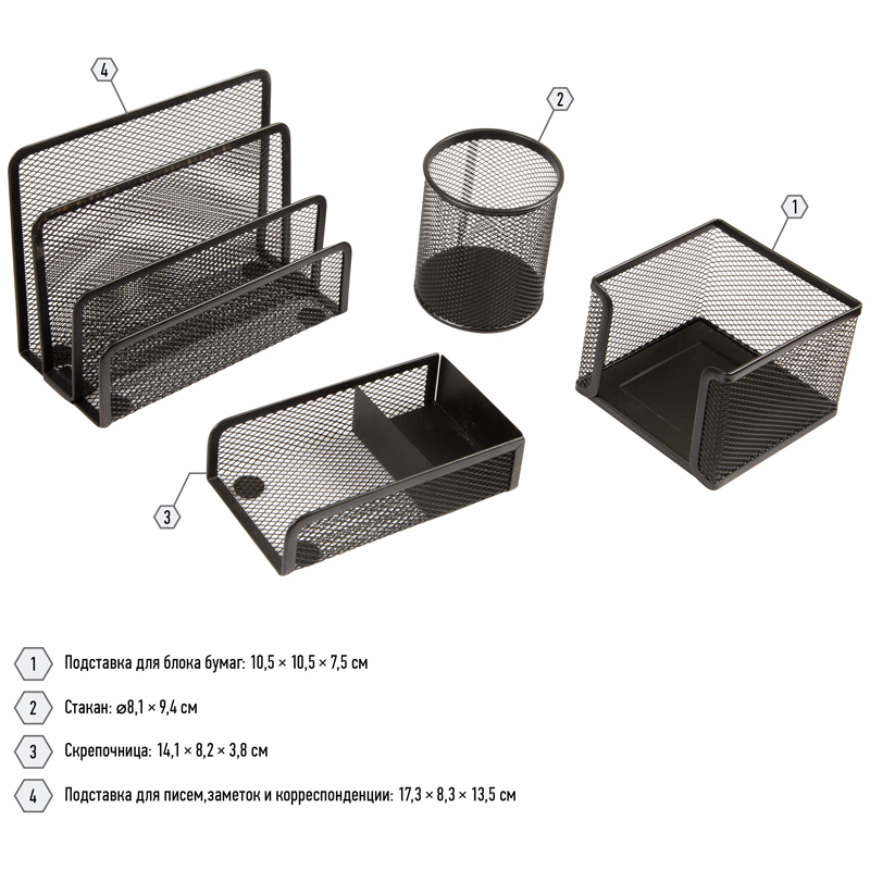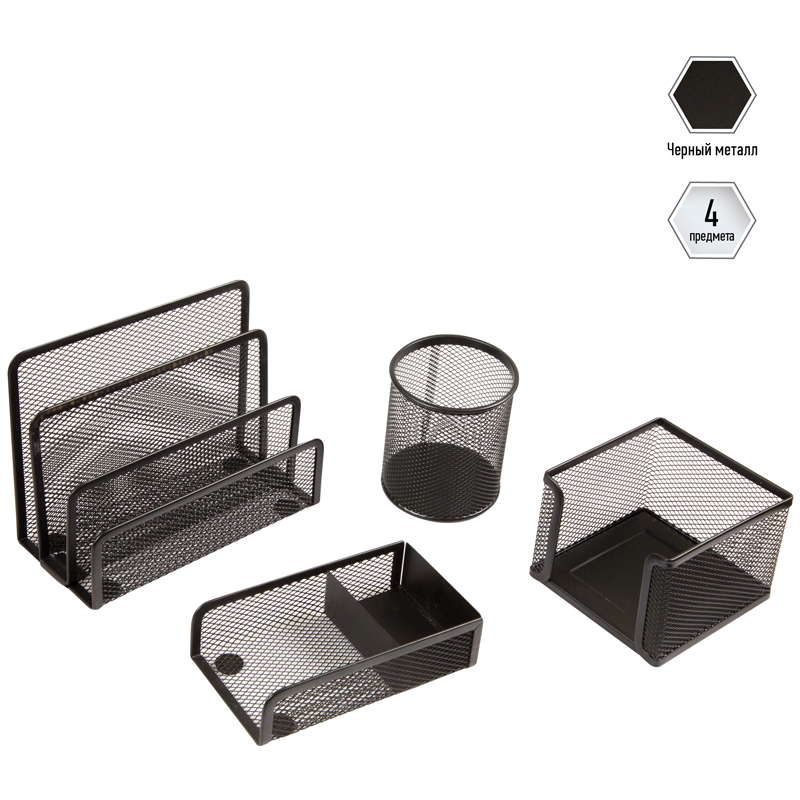 Стильный и функциональный набор из 4 предметов. Предметы изготовлены из металлической сетки. Упаковка в лакированную коробку. У всех подставок в наборе имеются мягкие подушечки на дне, предотвращающие скольжение и повреждения поверхности. Черный цвет. Прочный корпус из высококачественного металла. Сетчатое исполнение предотвращает образование пыли внутри. В комплект набора входят 4 предмета: подставка-органайзер для пишуших принадлежностей,<br/>подставка для бумаг и писем, 3-х секционная,<br/>подставка для бумажного блока размером 100х100 мм,<br/>подставка-органайзер 2-х секционная.