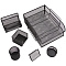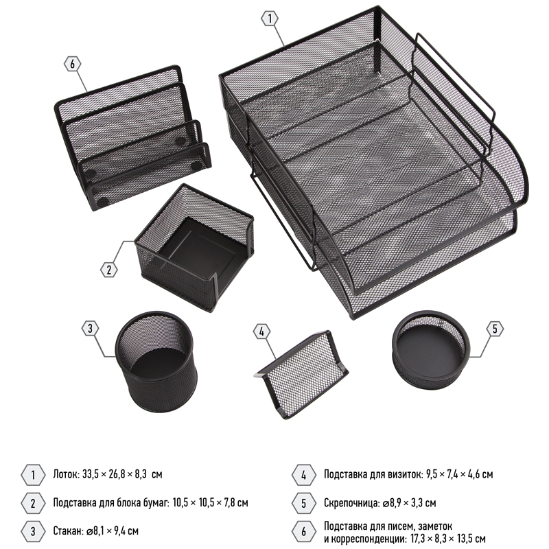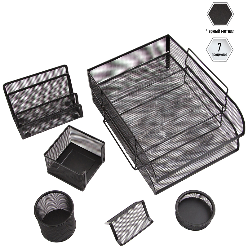 Настольный набор из металла Berlingo Steel&Style, 7 предметов, чёрный 268942<br/>Настольный набор Berlingo Steel&Style чёрного цвета – это пример строгости, лаконичности и функциональности. У подставок имеются мягкие подушечки на дне, предотвращающие скольжение и повреждения поверхности, а прочный корпус изготовлен из высококачественного металла. Сетчатое исполнение предотвращает образование пыли внутри. <br/>В набор входят: 2 поддона для бумаг (33,5*26,8*8,3 см), 3-х секционная подставка для писем и корреспонденции (17,3*8,3*13,5 см), подставка для бумажного блока (10,5*10,5*7,8 см), подставка-органайзер для канцелярских мелочей (диаметр – 8,9*3,3 см), подставка-органайзер для пишущих принадлежностей (диаметр – 8,1*9,4 см), подставка для визиток (9,5*7,4*4,6 см). <br/>• тип упаковки: подарочная лакированная коробка;<br/>• основной материал: металл;<br/>• количество предметов в наборе: 7 шт.