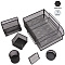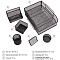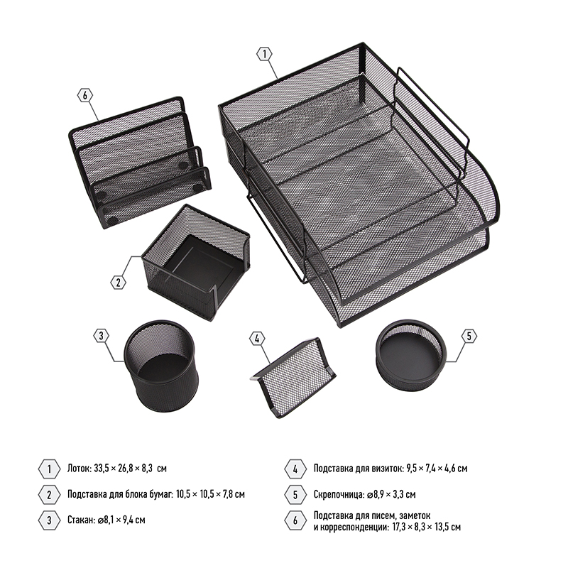 В набор входят: 2 поддона для бумаг (33,5*26,8*8,3 см), 3-х секционная подставка для писем и корреспонденции (17,3*8,3*13,5 см), подставка для бумажного блока (10,5*10,5*7,8 см), подставка-органайзер для канцелярских мелочей (диаметр – 8,9*3,3 см), подставка-органайзер для пишущих принадлежностей (диаметр – 8,1*9,4 см), подставка для визиток (9,5*7,4*4,6 см).