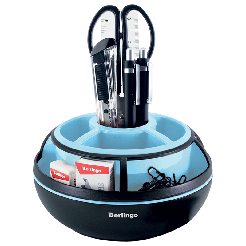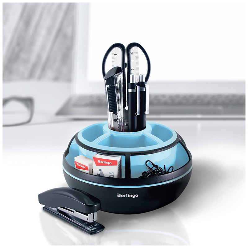 Настольный органайзер Berlingo Instinct с 10 секциями – это сочетание удобства и эстетики. Качественное наполнение органайзера подчеркнуто сочетанием цветов – пастельного аквамаринового и лаконичного чёрного. Качественный первичный пластик, 10 отделений и возможность вращения на 360 градусов позволяют удобно пользоваться органайзером из любого положения. В состав настольного органайзера входят: механический карандаш, автоматическая шариковая ручка, степлер, ножницы, канцелярский нож, линейка, скрепки, ластик, скобы для степлера. <br/>• Материал: пластик;<br/>• Цвет: чёрный/аквамарин;<br/>• Количество секций:10;<br/>• Количество предметов: 9.