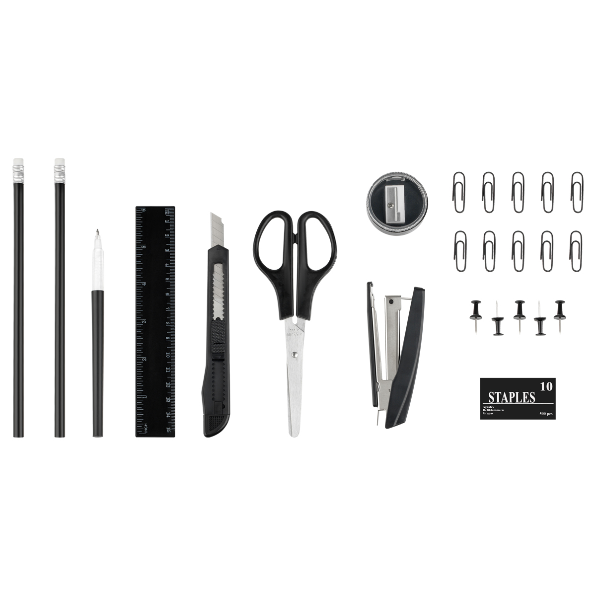 В состав набора входят: ручка шариковая, два карандаша, точилка для карандашей, степлер для скоб №10, скобы №10, линейка, ножницы, скрепки канцелярские 10 шт., кнопки силовые 5 шт., нож канцелярский.