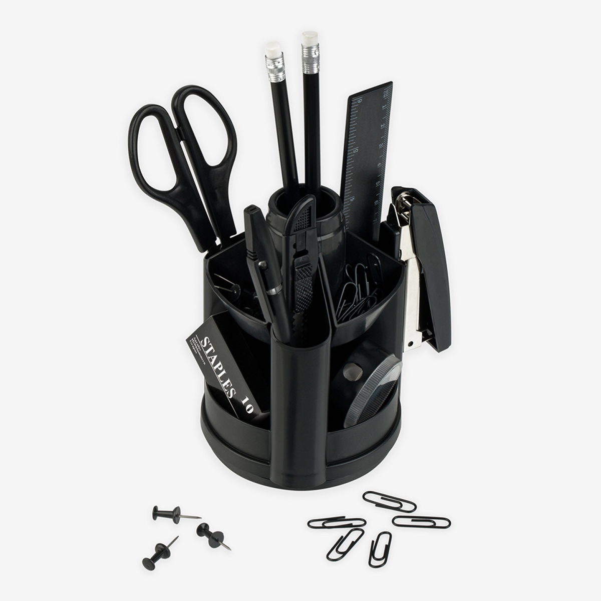 Стильный настольный органайзер OfficeSpace "Минидеск" идеально будет смотреться на любом рабочем столе. Изделие выполнено из прочного высококачественного пластика, что гарантирует надёжность и безопасность. Набор "Минидеск" вращается и имеет 10 отделений под разные канцелярские предметы. Изделие упаковано в картонную коробку, в которую аккуратно вложены все предметы набора.<br/>В состав набора входят: ручка шариковая, два карандаша, точилка для карандашей, степлер для скоб №10, скобы №10, линейка, ножницы, скрепки канцелярские 10 шт., кнопки силовые 5 шт., нож канцелярский.<br/>∙ Цвет: чёрный;<br/>∙ Количество предметов: 11 штук;<br/>∙ Тип упаковки: картонная коробка;<br/>∙ Основной материал: пластик.<br/>