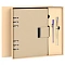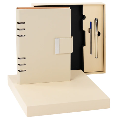 Подарочный набор включает в себя недатированный ежедневник на кольцах с внутренним блоком из 100 листов кремовой бумаги плотностью 70 г/м2. Благодаря классическому формату А5 (165x229 мм) ежедневник удобно использовать как в офисе, так и на выездных деловых встречах. Твердая обложка стилизована под текстурную кожу. Ежедневник фиксируется магнитной застежкой, поэтому не откроется в сумке или портфеле и страницы не помнутся.