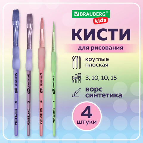 Кисти c EVA вставкой НАБОР 4шт. (синтетика круглые 4,8,12; плоская №10),блистер BRAUBERG KIDS, 201095