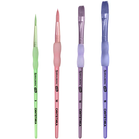 Кисти из синтетики отлично впитывают и отдают краску, хорошо держат форму, долговечны и надежны. Благодаря кистям № 3 и 10 ребенку будет комфортно прорисовывать мелкие детали. Кисти №10 и 15 позволят делать более крупные мазки и линии. Пластиковую рукоятку c мягкой силиконовой вставкой удобно держать в руке.