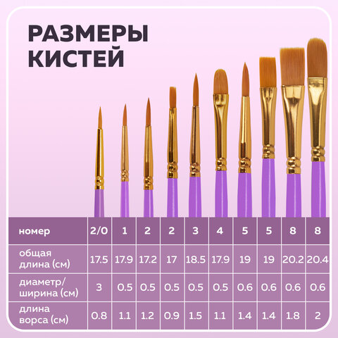 Кисти BRAUBERG PREMIUM, набор 10 шт. (синтетика, круглые № 1, 2, 3, 5, 8, плоские № 2, 4, 6, 8, 10), 201027