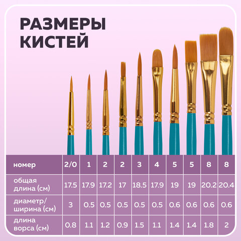 Кисти BRAUBERG PREMIUM, набор 10 шт. (синтетика, круглые № 1, 2, 3, 5, 8, плоские № 2, 4, 6, 8, 10), 201027