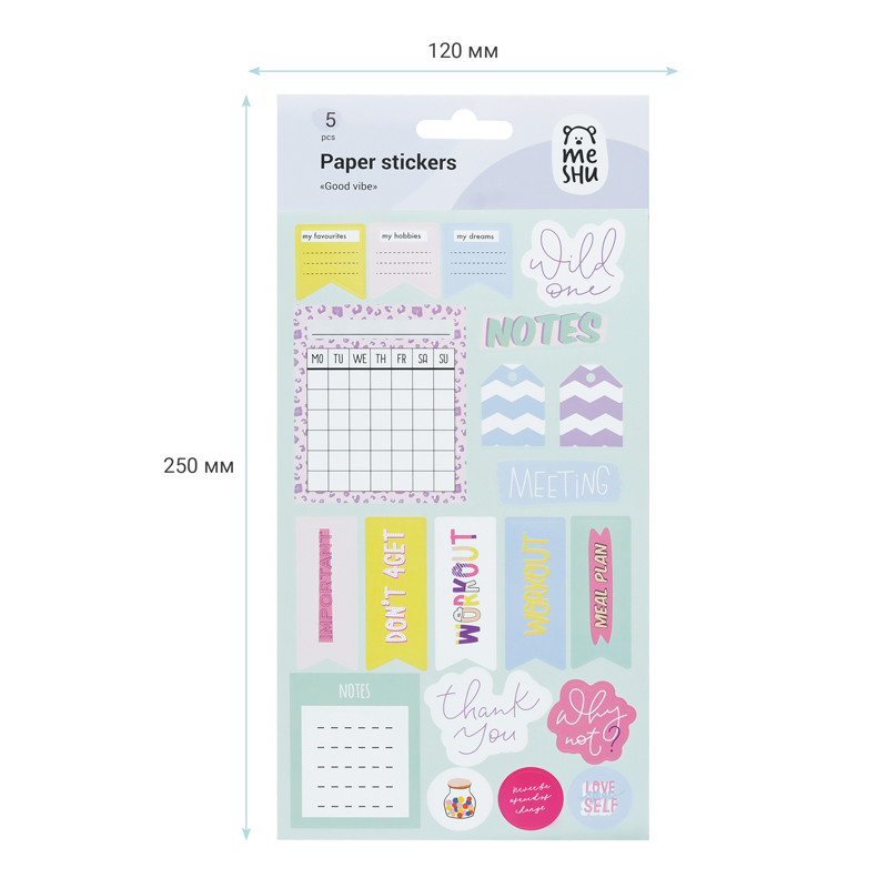 Наборы бумажных наклеек MESHU Good vibe идеально подходят для оформления записей, открыток, поделок, а также украшения канцтоваров, телефонов, ноутбуков, предметов интерьера. Набор состоит из 5 листов, 150-200 наклеек размером 210*120 мм и включает в себя 150-200 наклеек. Яркие современные дизайны сделают творческий процесс увлекательным и подарят отличное настроение.<br/>• Материал: бумага;<br/>• Размер листа: 210*120 мм;<br/>• Количество наклеек: 150-200.