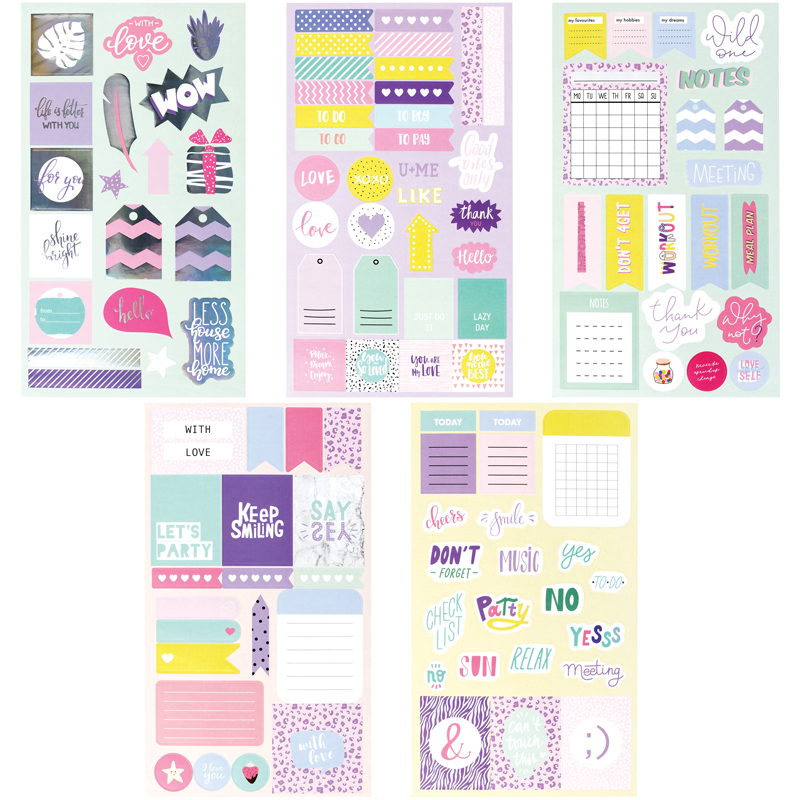 Наборы бумажных наклеек MESHU Good vibe идеально подходят для оформления записей, открыток, поделок, а также украшения канцтоваров, телефонов, ноутбуков, предметов интерьера. Набор состоит из 5 листов, 150-200 наклеек размером 210*120 мм и включает в себя 150-200 наклеек. Яркие современные дизайны сделают творческий процесс увлекательным и подарят отличное настроение.