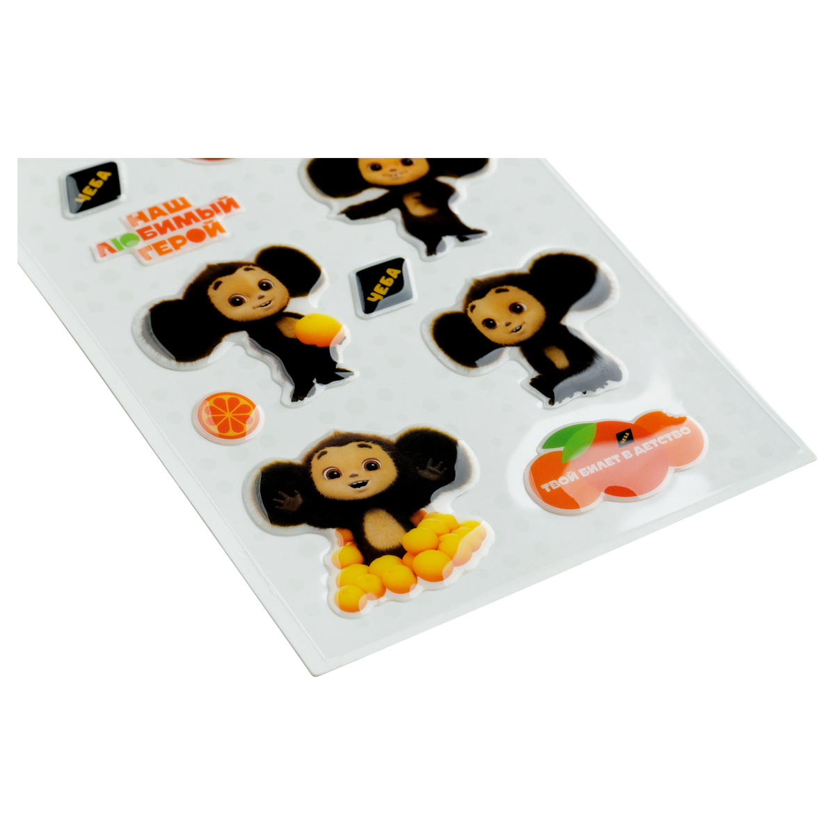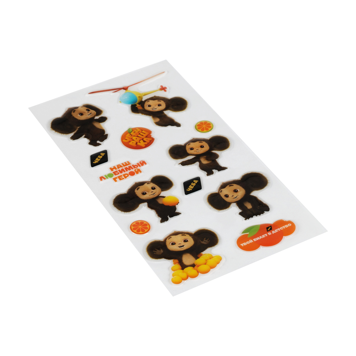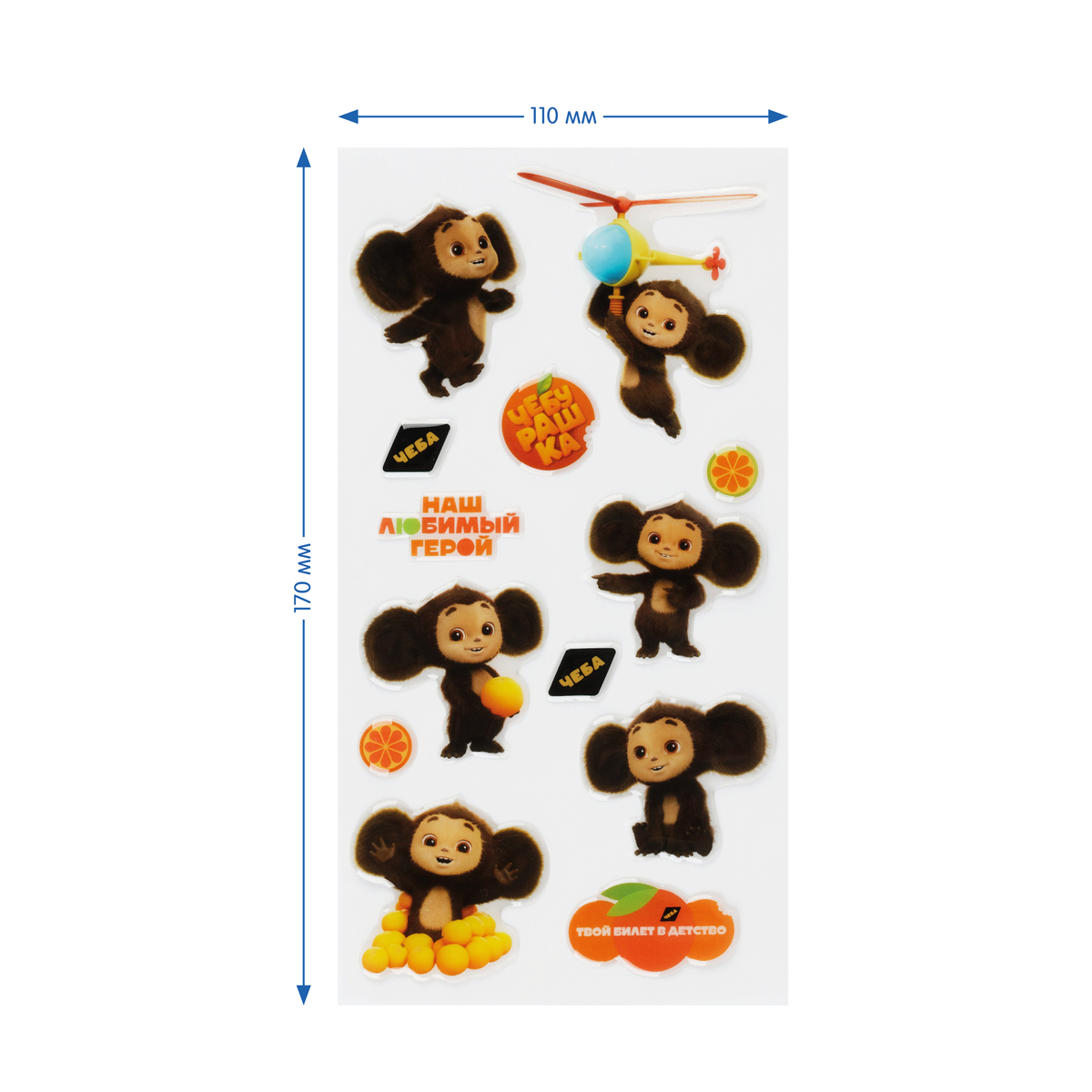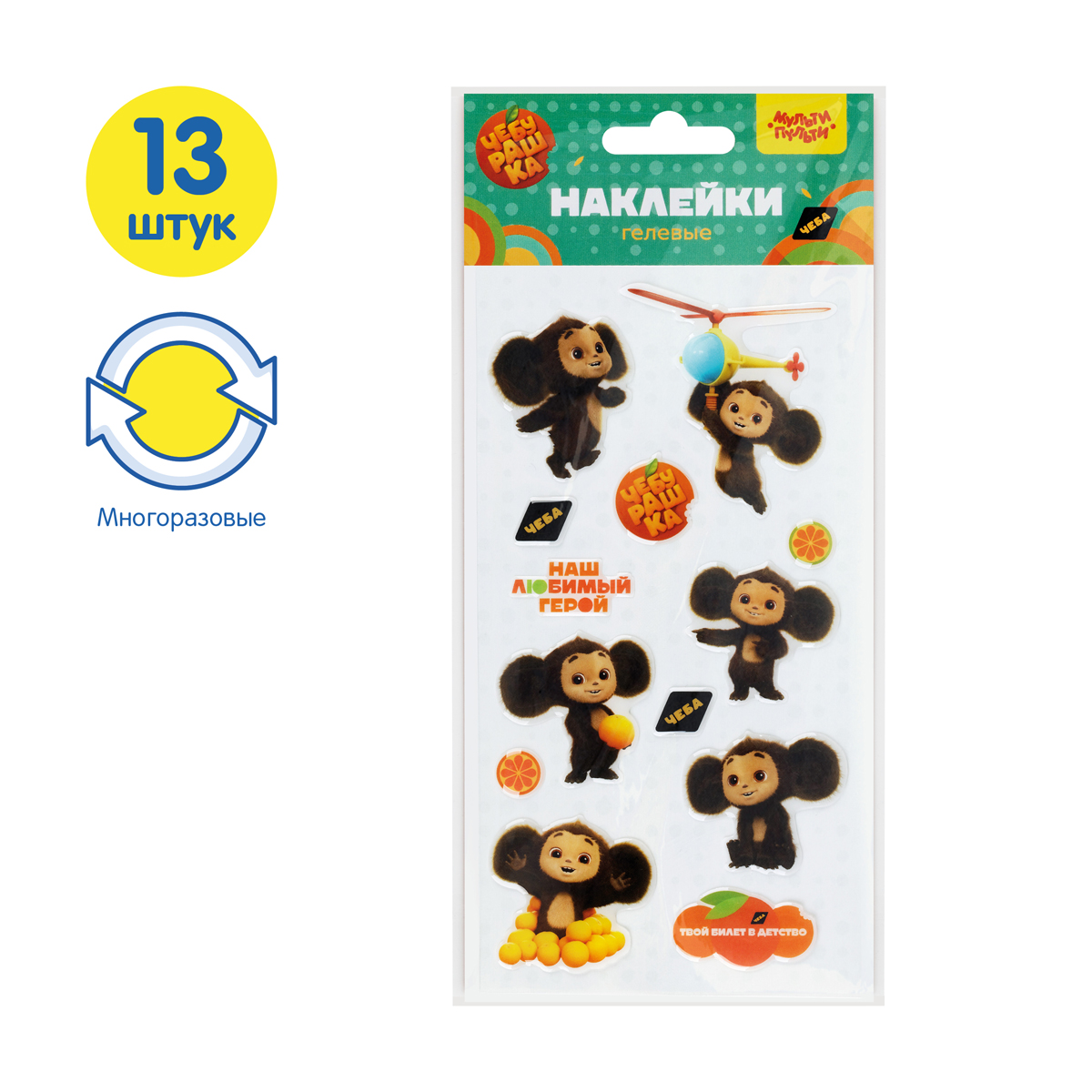 Эпоксидные наклейки «Мульти-Пульти» серии «Чебурашка» предназначены для декорирования поверхностей, а также для игр, оформления рисунков и открыток. Размер листа — 110*220 мм. В набор входят 13 наклеек, шесть из которых с изображением любимого героя детей и взрослых — Чебурашкой.