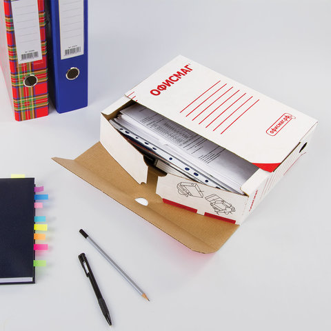 Архивный короб ОФИСМАГ с клапаном используется для хранения различной бумажной документации в архивах налоговых инспекций, бухгалтерий, учебных заведений, паспортных столов, банков и т.д.