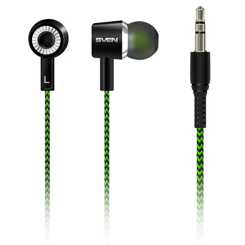 SVEN E-107 – это внутриканальные наушники в черном корпусе с зеленым проводом в тканевой оплетке, которые гарантируют максимальный комфорт во время эксплуатации.