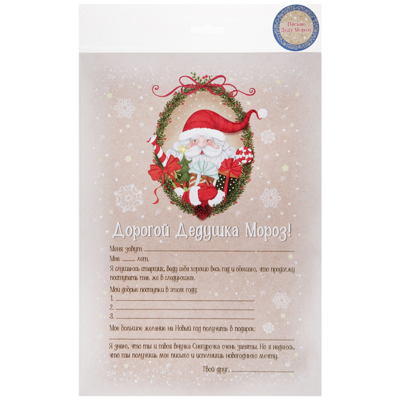 Новогоднее письмо Деду Морозу - это готовый шаблон, который позволит без труда создать послание новогоднему волшебнику и рассказать о самых сокровенных желаниях. Письмо выполнено на качественной бумаге и украшено красочными рисунками. Есть на нем и печать, позволяющая почте Деда Мороза доставить письмо по правильному адресу. В бланке письма можно писать ручками, карандашами или фломастерами и даже рисовать то, что захочется. В новогодний набор вместе с письмом входит также готовый и оформленный конверт из бумаги.