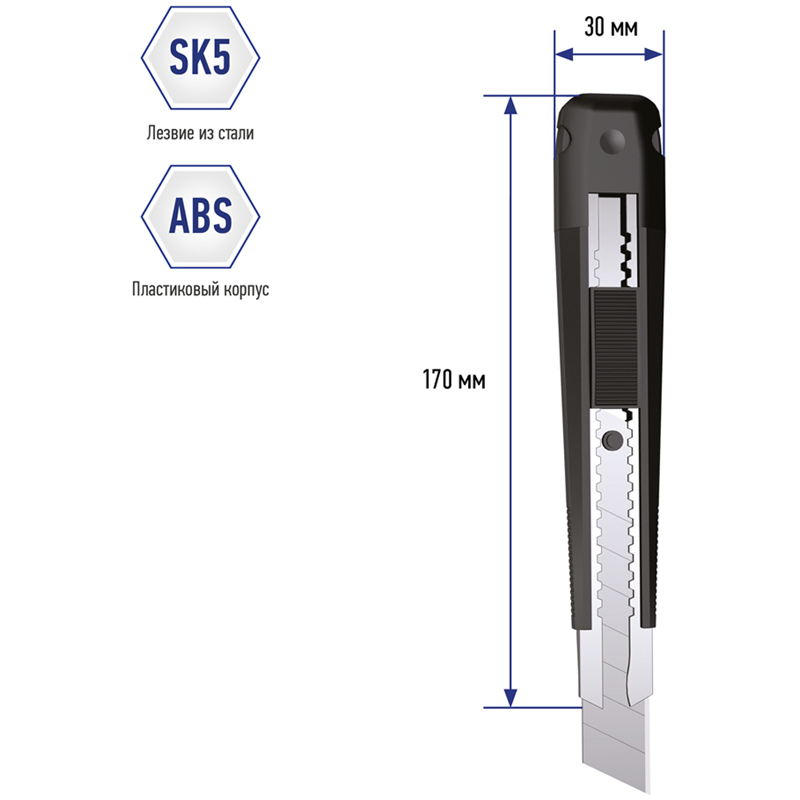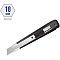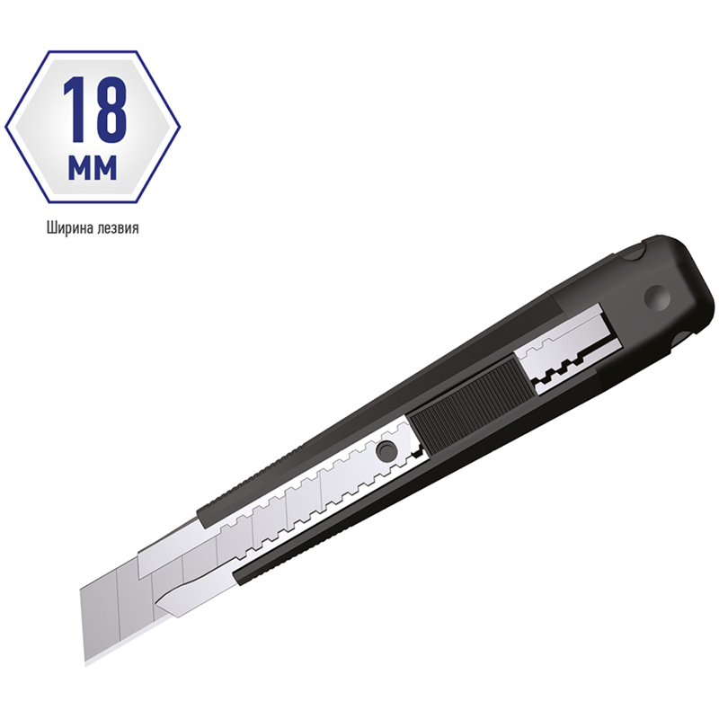 Серия "Hyper". Нож канцелярский с автоматической системой фиксации лезвия auto-lock. Корпус ножа выполнен из высококачественного ABS пластика. Цвет корпуса - черный. Комплектуется износостойким лезвием из стали SK5. Ширина лезвия - 18 мм. Оснащен металлическими направляющими для плавного движения лезвия. Индивидуальная упаковка - блистер с европодвесом.
