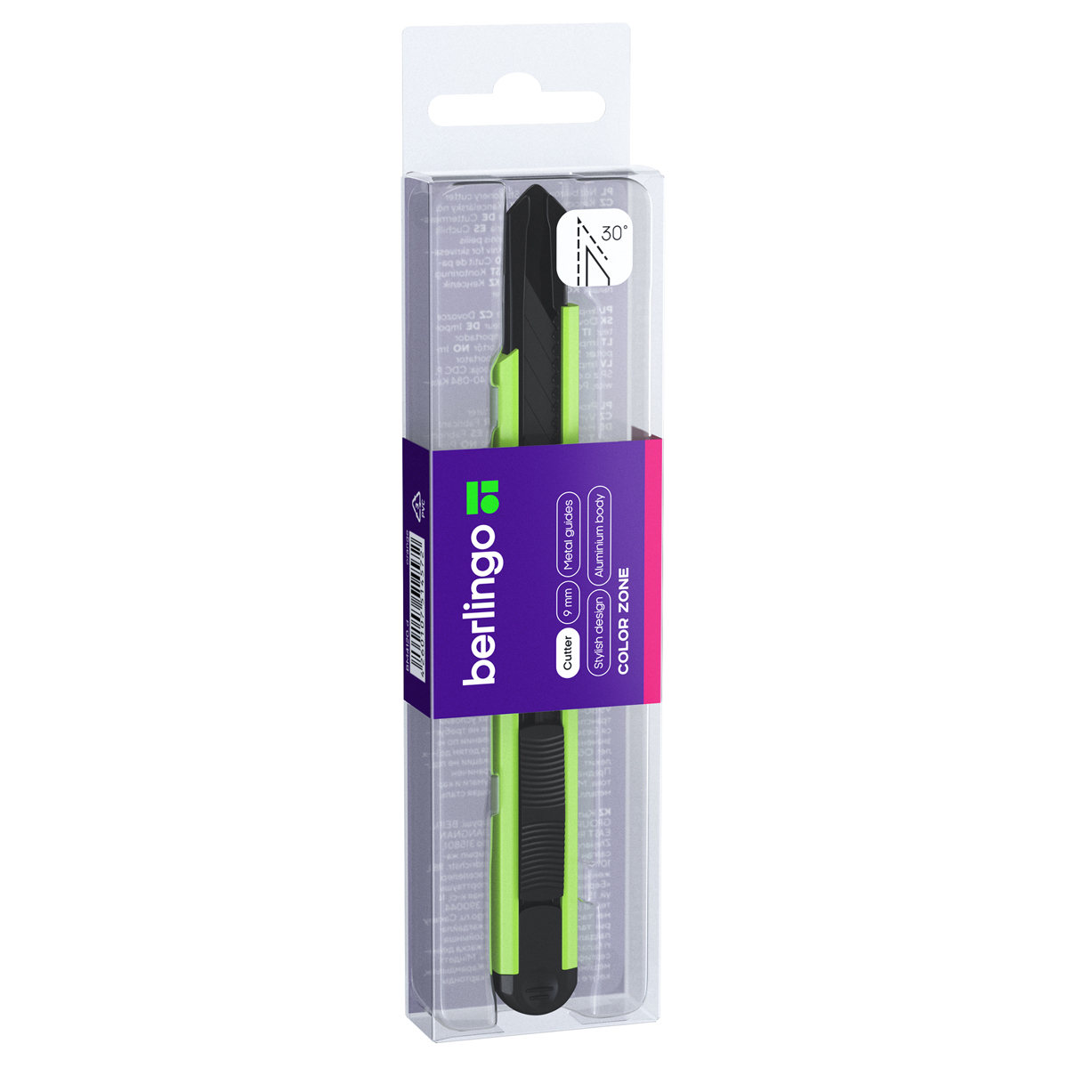 Серия ColorZone . Нож канцелярский с автоматической системой фиксации лезвия auto-lock. Корпус ножа полностью металлический. Комплектуется износостойким стальным лезвием с углом 30 градусов черного цвета, для более легкого скольжения. Ширина лезвия - 9 мм.Индивидуальная упаковка - пластиковый бокс с европодвесом.