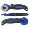 Снабжен отверстием для подвеса и автофиксатором. Удобная прорезиненная ручка предотвращает скольжение руки во время работы. Имеется защитный футляр для лезвия.