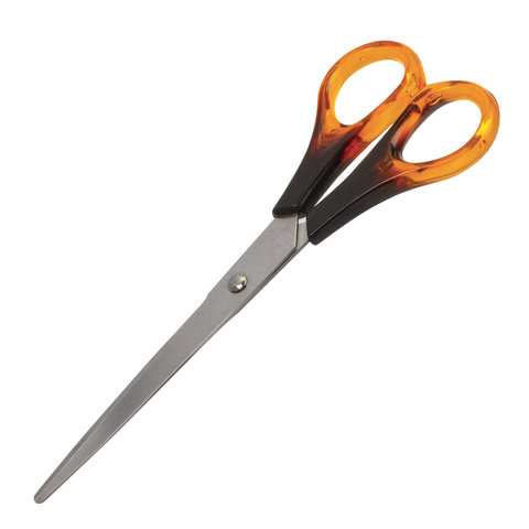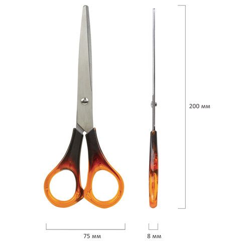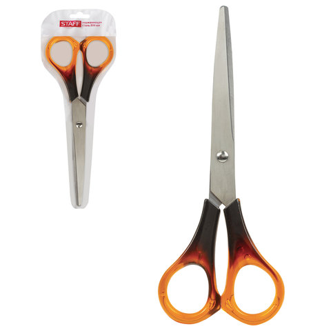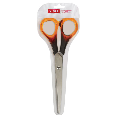 Лезвия ножниц STAFF изготовлены из высокопрочной нержавеющей стали. Материал не подвержен коррозийным процессам, отличается износостойкостью, надежностью и долговечностью. Концы острых лезвий закругленной формы, что обеспечивает большую степень безопасности использования. Заточка лезвий двустороняя, что позволяет сохранить режущие свойства на протяжении длительного времени. Симметричные ручки изготовлены из качественного пластика, имитирующего янтарь. Модель предназначена для правшей. Общая длина ножниц - 200 мм. Продается в ПВХ-чехле с европодвесом.