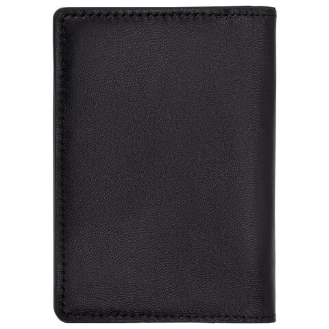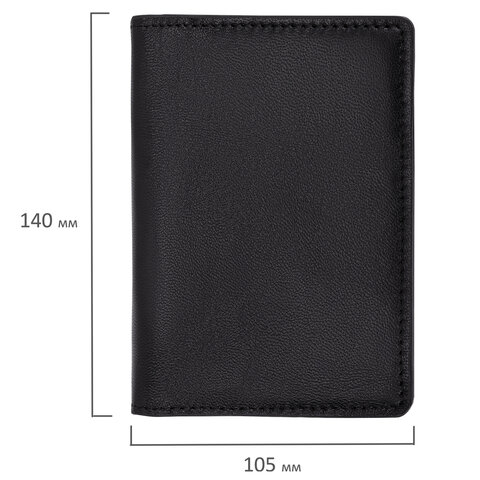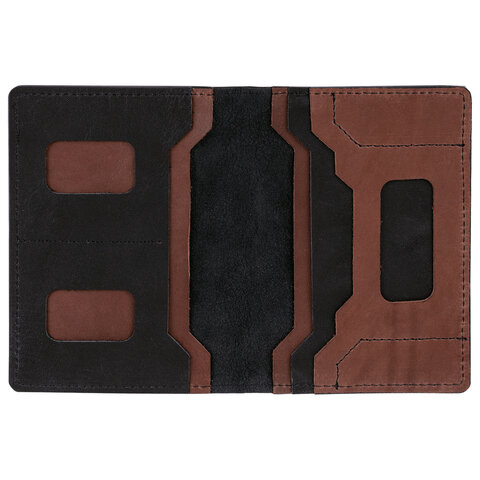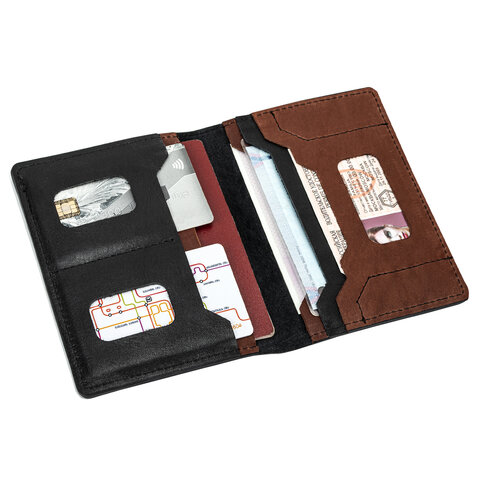 Модель выполнена из натуральной кожи насыщенного чёрного и тёмно-коричневого цветов. На внутреннем развороте расположены кожаные карманы, которые вмещают не менее 7 документов и предназначены: для паспорта, для водительских прав нового образца, для документов (СНИЛС, СТС и др.), а также кармашки для карт. Благодаря большому количеству карманов для документов и компактному размеру 105х140 мм обложку удобно всегда носить с собой.