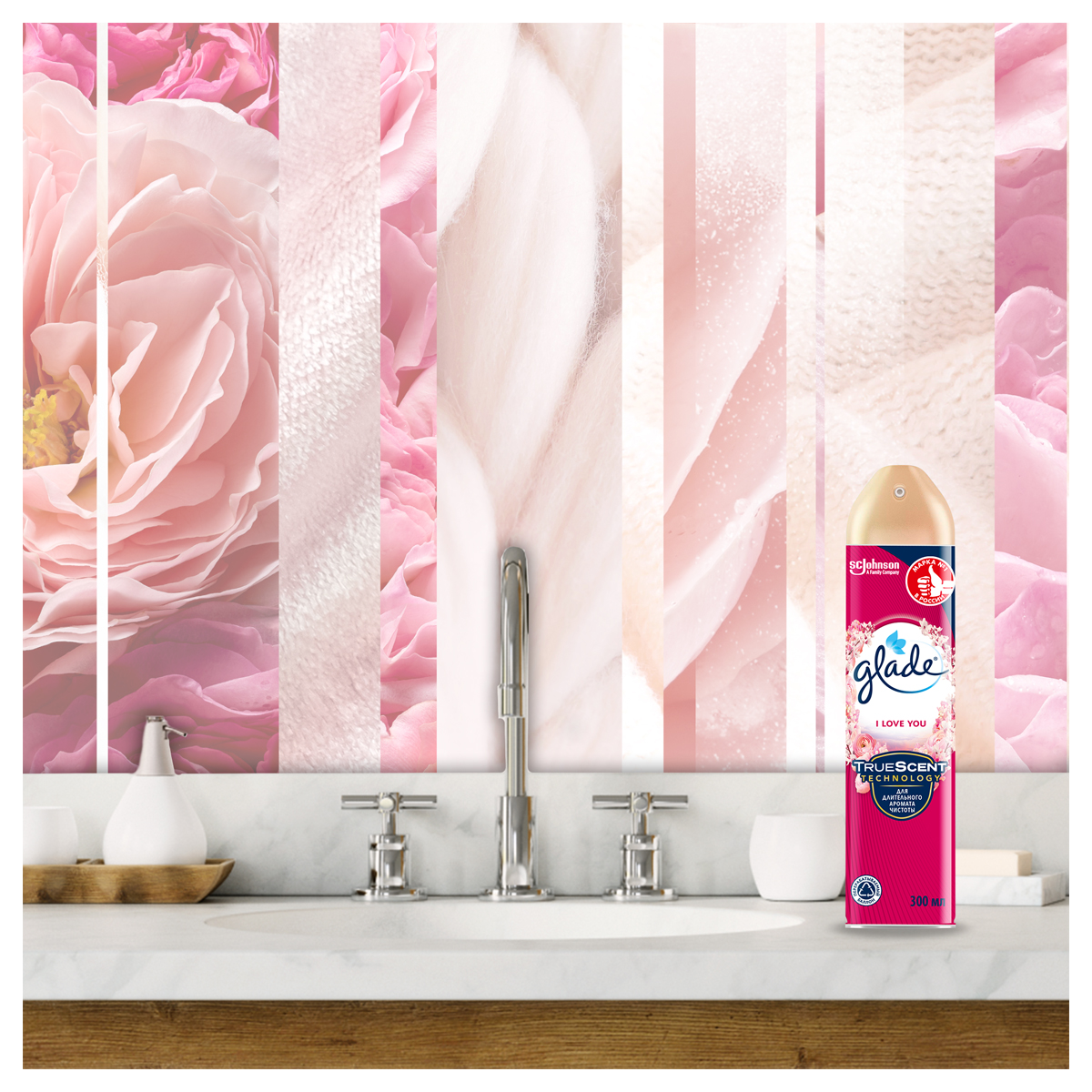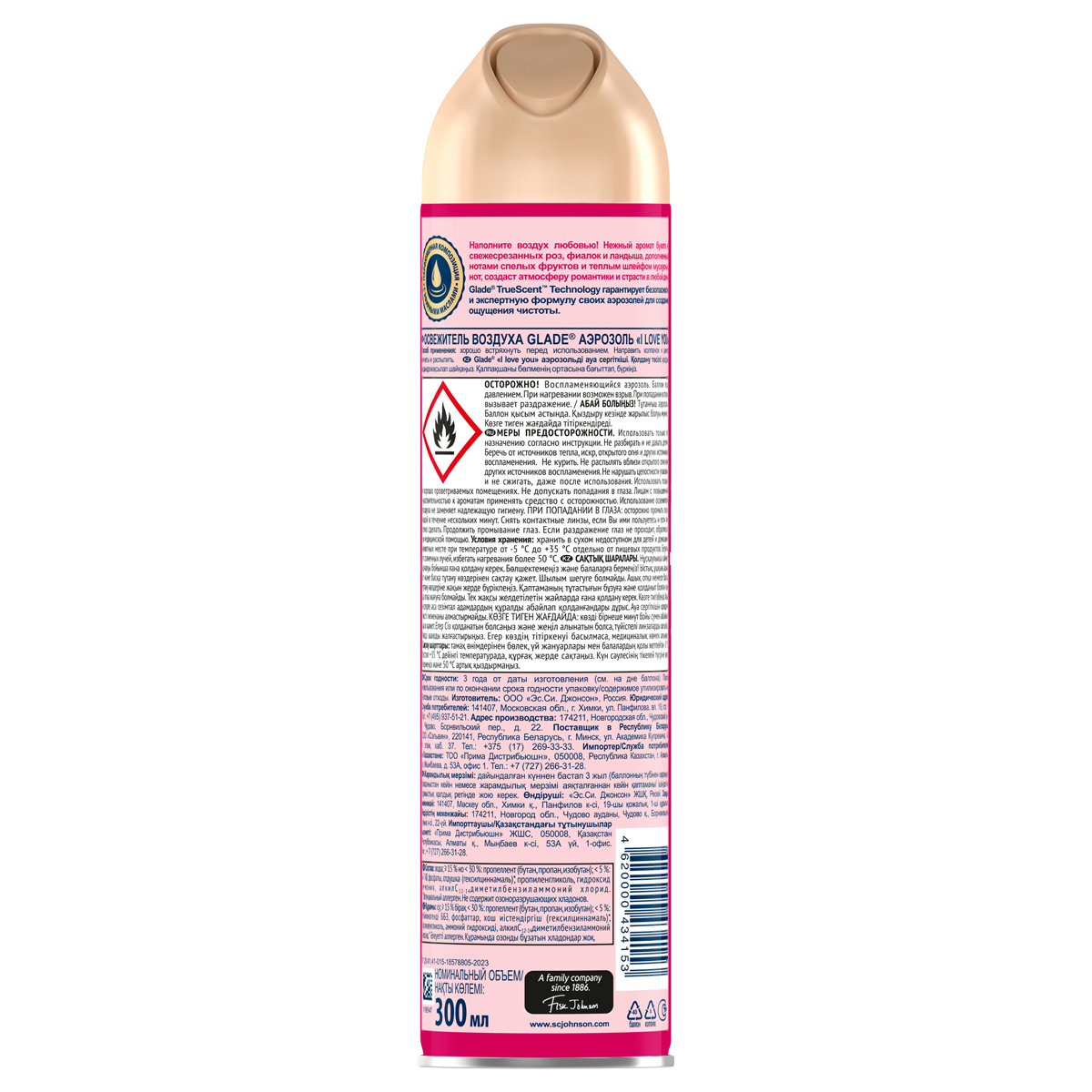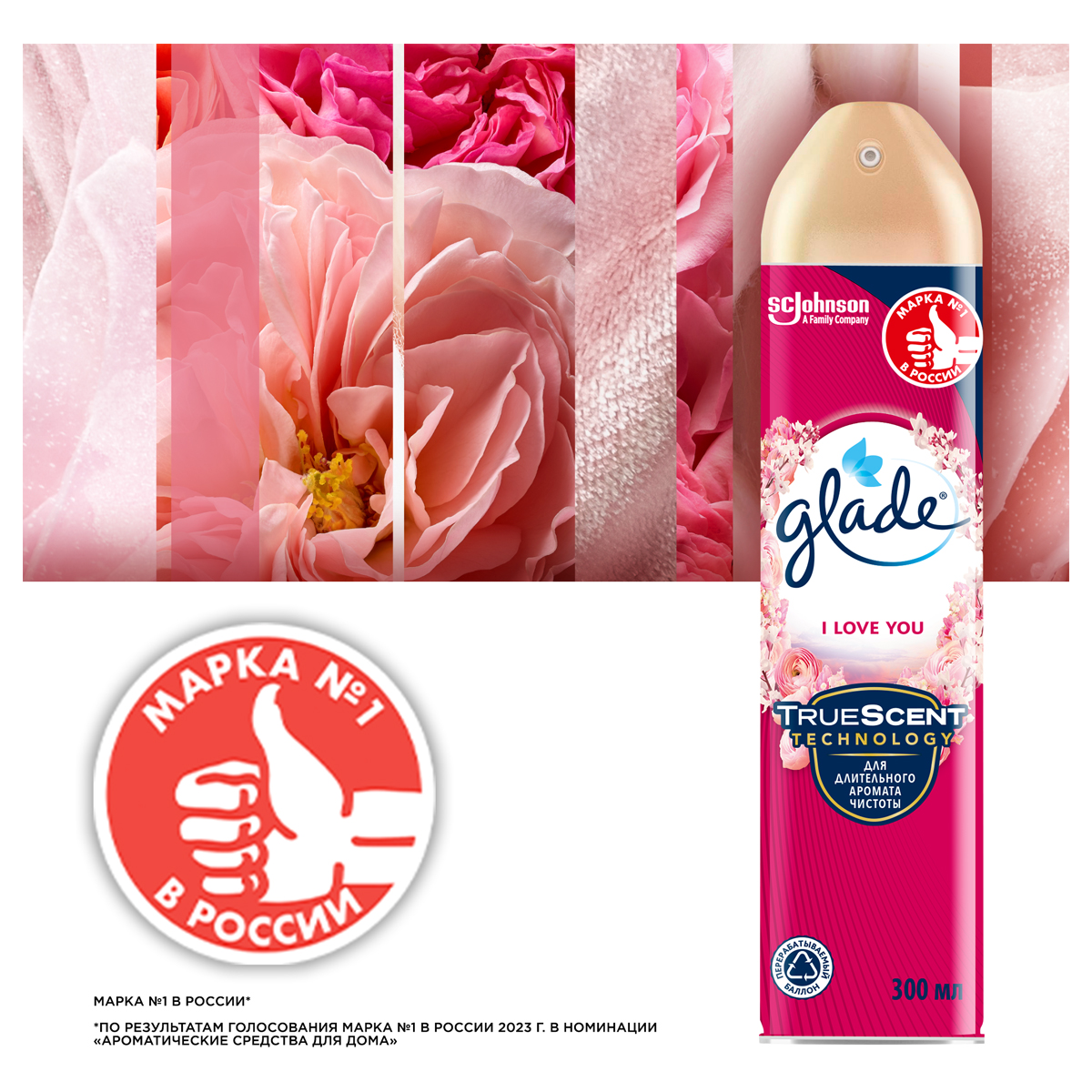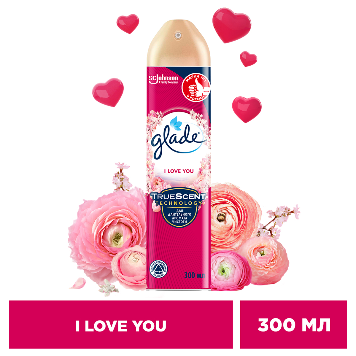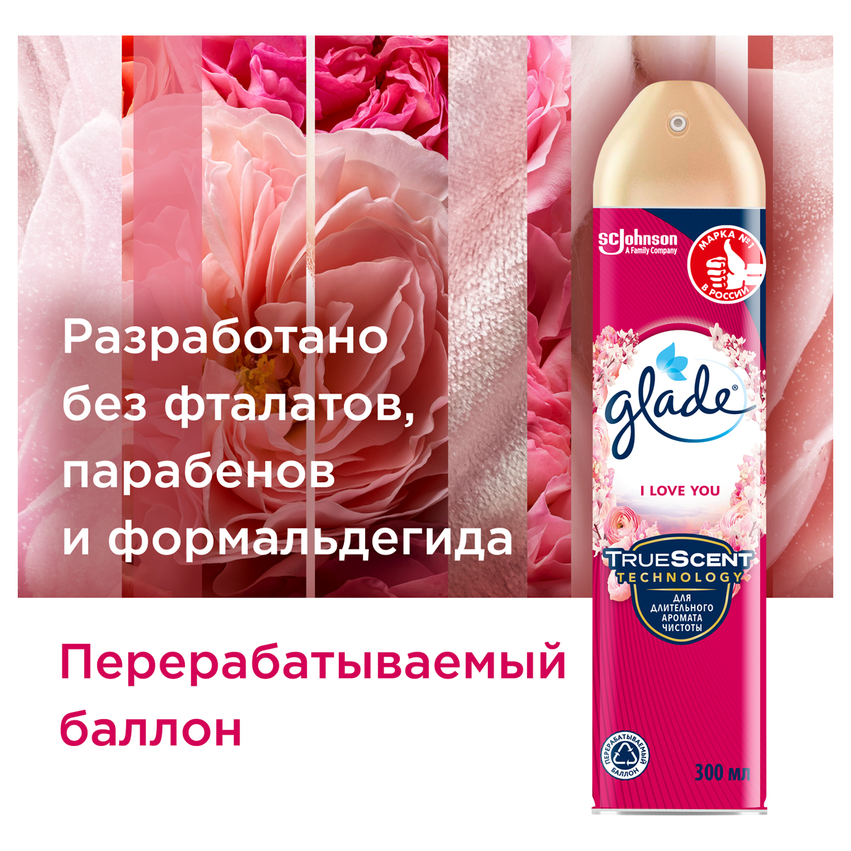 Наполните воздух любовью! Нежный аромат букета из свежесрезанных роз, фиалок и ландыша, дополненный нотами спелых фруктов и теплым шлейфом мускусных нот, создаст атмосферу романтики и страсти в любой день!<br/>Glade® TrueScent™ Technology гарантирует безопасность и экспертную формулу своих аэрозолей для создания ощущения чистоты. Состав: <br/>Вода, ≥ 15 % но < 30 %: пропеллент (бутан, пропан, изобутан); < 5 %: н-ПАВ, фосфаты, отдушка (гексилциннамаль)*, пропиленгликоль, гидроксид аммония, алкилС12-14диметилбензиламмоний хлорид. *Потенциальный аллерген. Не содержит озоноразрушающих хладонов.<br/>Способ применения: <br/>Хорошо встряхнуть перед использованием. Направить колпачок к центру комнаты и распылить.
