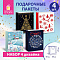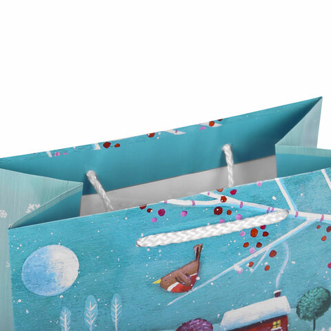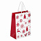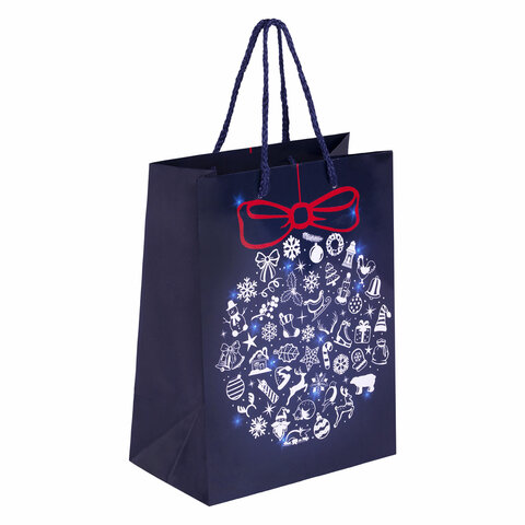 Пакет изготовлен из ламинированной мелованной бумаги с веревочными ручками из полипропилена. Размер – 18х10х23 см. В наборе – 4 пакета с изображением разных новогодних атрибутов.