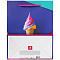 Изготовлен из ламинированного мелованного картона с веревочными ручками из полипропилена. Размер - 18x10x23 см. Пакет выполнен в ярких цветах с изображением мороженого в рожке. С лицевой стороны пакета некоторые детали покрыты тиснением золотистой фольгой.