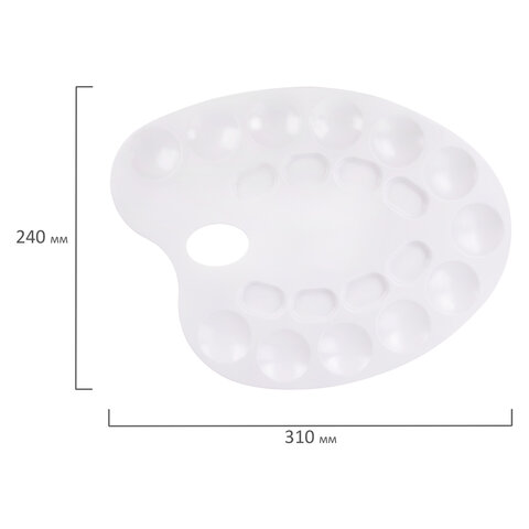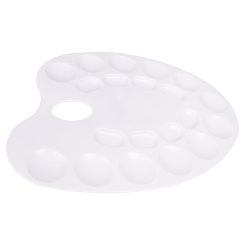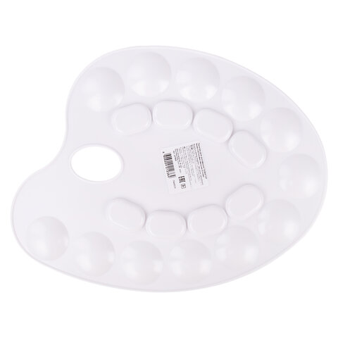 Легко отмывается после использования. Имеет 8 отделений для смешивания красок и 12 отделений для размещения красок. Палитра овальной формы с отверстием для удобства держания в руке изготовлена из высококачественного полистирола белого цвета. Размер - 24 х 31 х 0,6 см.