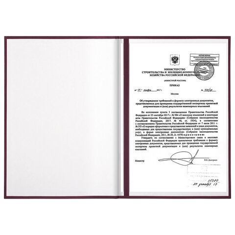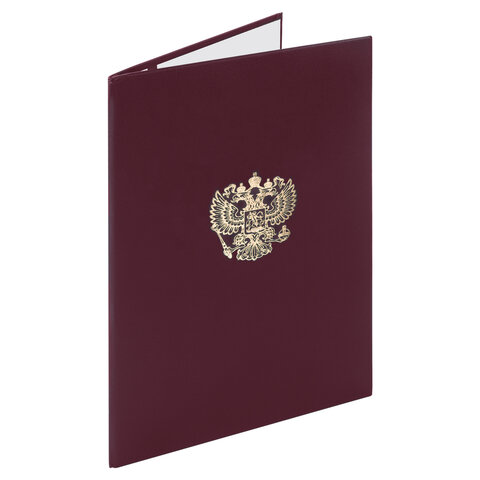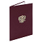 Изготовлена из прочного картона, покрытого бумвинилом. Папка формата А4 универсального назначения выполнена в насыщенном бордовом цвете. На обложке - герб РФ, нанесенный с помощью золотого тиснения. Снабжена лентой для удержания документов (ляссе). Предусмотрено нанесение логотипа.