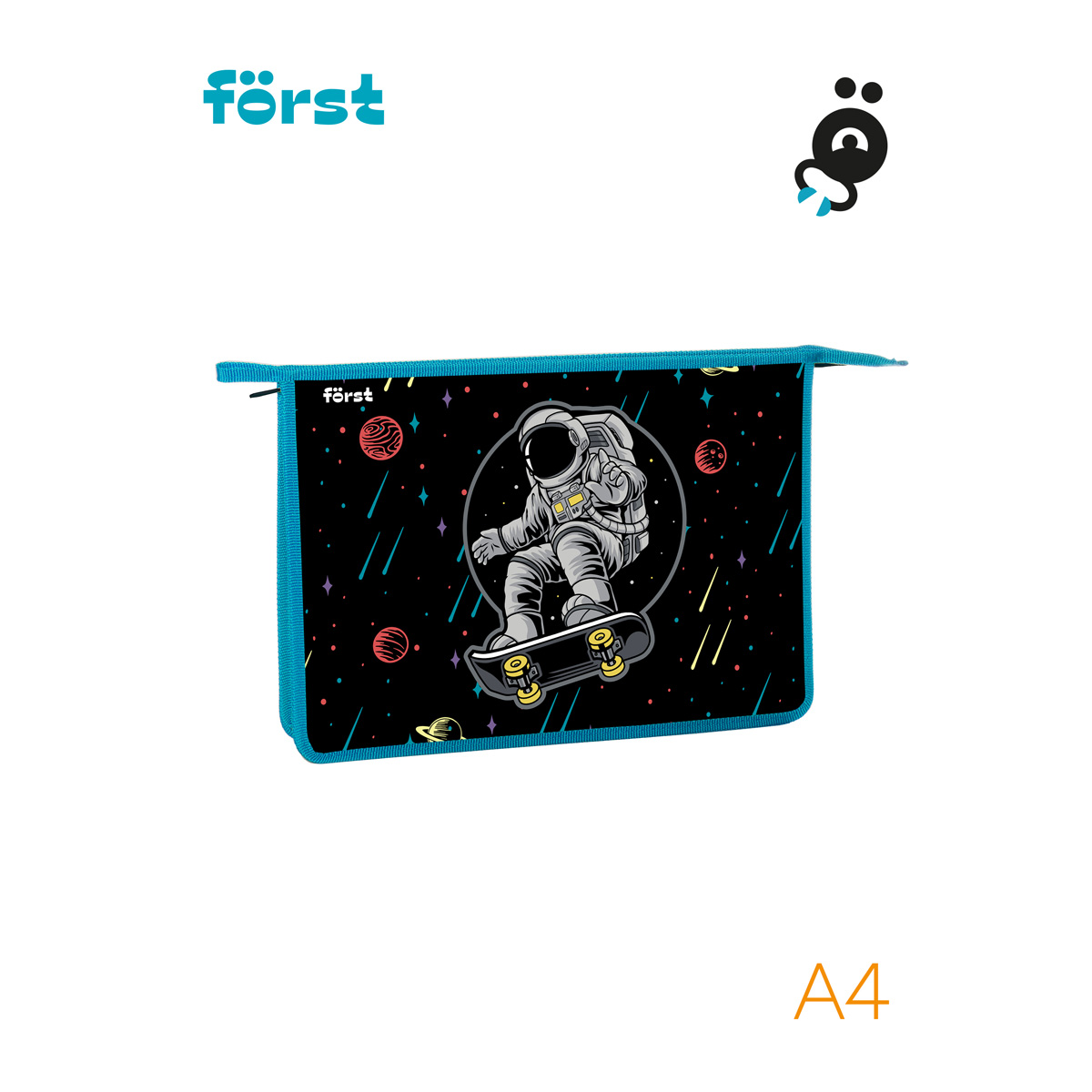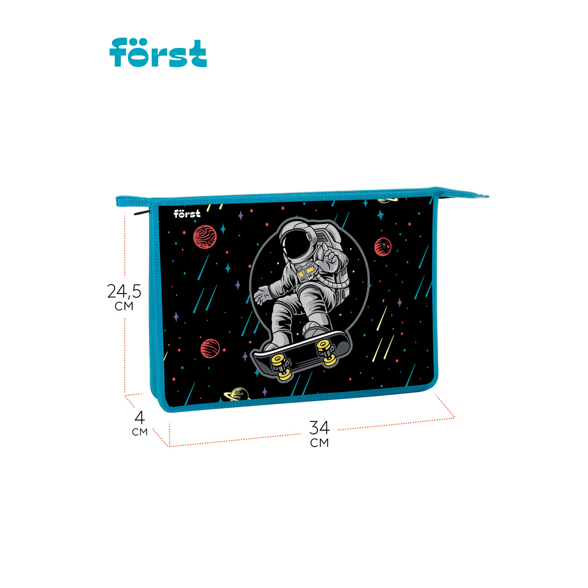 Папка для тетрадей на молнии Först Outer space формата А4 предназначена для хранения учебных принадлежностей. Изделие размером 340*245*40 мм имеет одно отделение. Застежка-молния сверху надежно защищает содержимое от грязи и влаги. Края папки имеют тканевую окантовку. Изготовлена из высококачественного пластика. <br/>• Формат: А4;<br/>• Материал: пластик, ткань;<br/>• Количество отделений: 1;<br/>• Тип застёжки: молния.