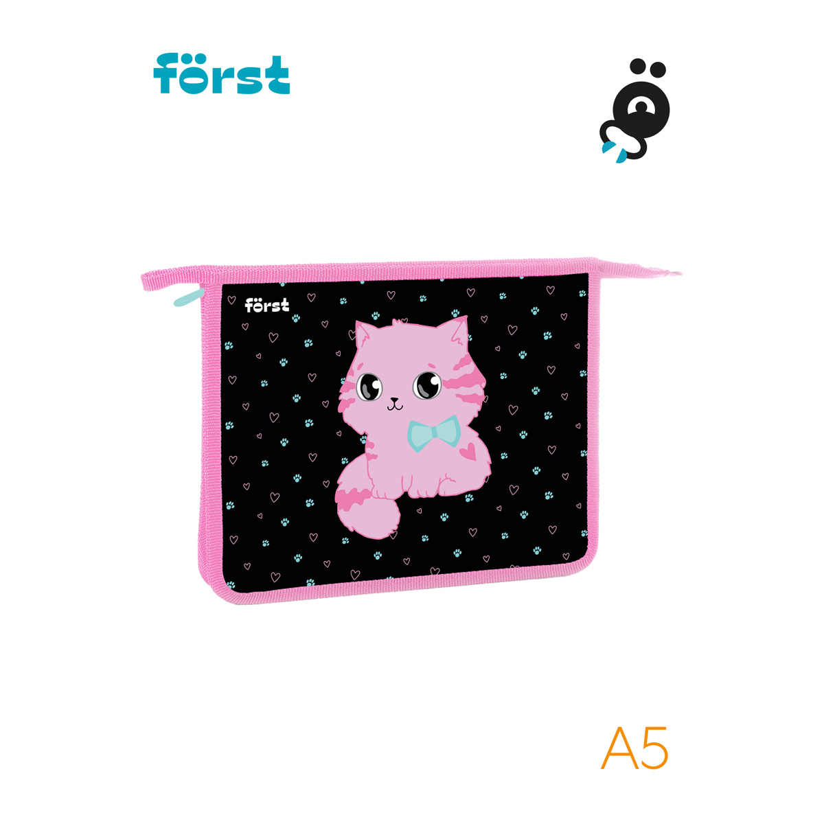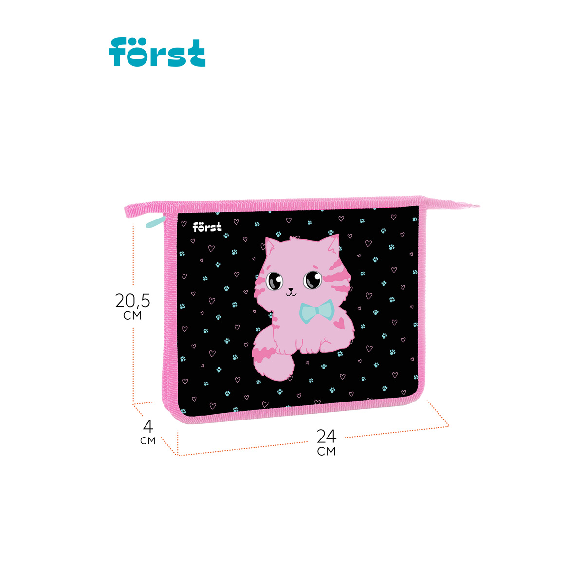 Папка для тетрадей на молнии Först Kitty-sweety формата А5 предназначена для хранения учебных принадлежностей. Изделие размером 240*205*40 мм имеет одно отделение. Застежка-молния сверху надежно защищает содержимое от грязи и влаги. Края папки имеют тканевую окантовку. Изготовлена из высококачественного пластика. <br/>• Формат: А5;<br/>• Материал: пластик, ткань;<br/>• Количество отделений: 1;<br/>• Тип застёжки: молния.